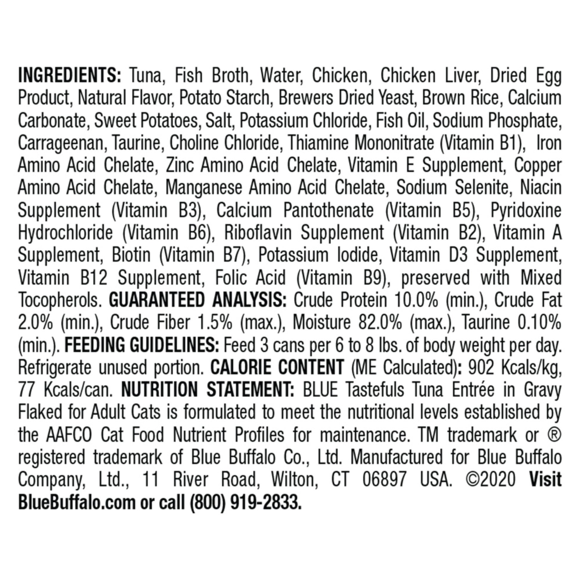 - DELICIOUS TUNA FIRST: The first ingredient in this BLUE Tastefuls cat food recipe is protein-rich tuna to support healthy muscle maintenance ; SAVORY FLAKED ENTRÉE: Tastefuls flaked wet cat food in savory gravy is so flavorful even finicky felines will come back for more. One taste is all it takes!