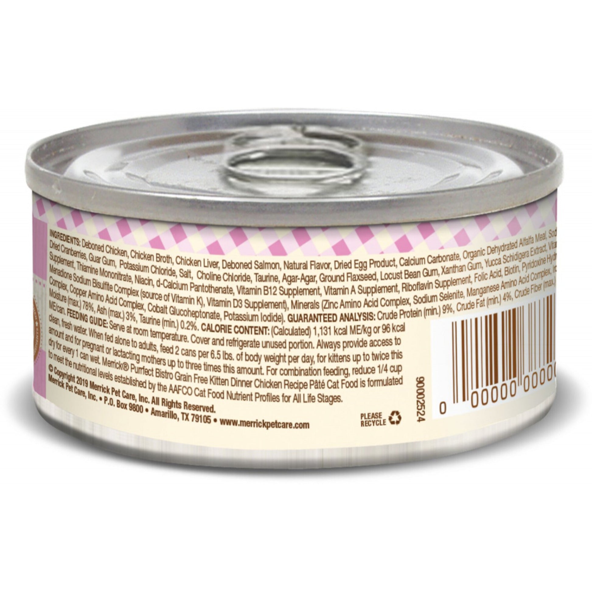 Merrick Purrfect Bistro Grain-Free Kitten Dinner Canned Cat Food provides a high protein and moisture content food with low levels of fat and carbohydrates for your growing kitten. Made with real, locally sourced meat and fresh produce, this recipe is the perfect choice for your new furry family member. As with all of Merrick’s recipes, Merrick Purrfect Bistro Grain-Free Kitten Dinner Canned Cat Food is made with no by-products and no artificial colors, flavors, or preservatives.