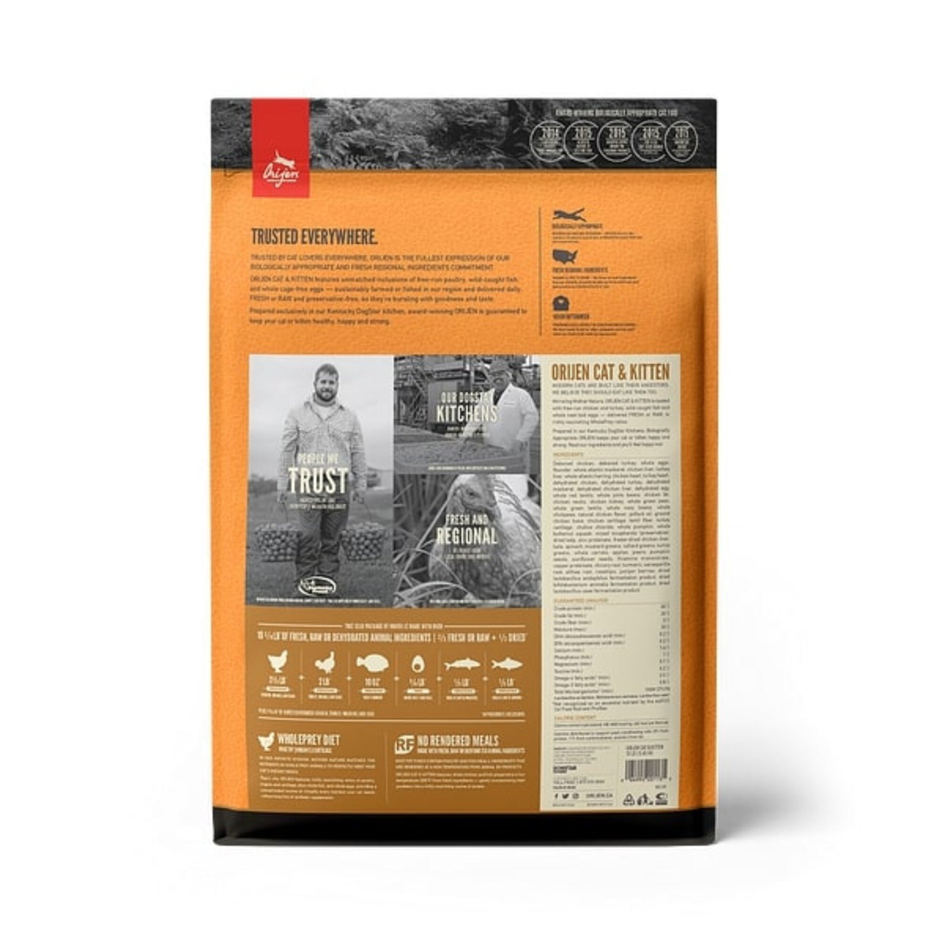 ORIJEN's goal is simple; provide the best possible food for your pet, period. Cats evolved as hunters - the structure of their teeth, jaws, and digestive system scientifically classifies them as carnivores, evolved to eat a meat based diet. Through a biologically appropriate diet packed with fresh meats, ORIJEN captures the carnivore in your pet and releases their inner instinct in each grain-free recipe. With 85-90% meat ingredients, ORIJEN has 3 times the meat of most conventional cat foods. Two thirds of the meats in every formula are raw or fresh, and never rendered or processed, so they are brimming with proteins, fats, vitamins and minerals. The high quality fresh meats and low-glycemic healthy carbohydrates are all sustainably sourced in the USA and made in Kentucky from trusted farmers. With heritage red meats from America's heartland, wild caught fish from New England, free run poultry and eggs, locally grown fruits, vegetables and botanicals such as butternut squash and Bartlett Pears, trusted sustainable American farmers are at the core of ORIJEN's business. The unmatched variety of high quality ingredients rival mother nature, supplying nutrients in their freshest, most natural flavorful form, mimicking the ancestral diet and keeping your pet's inner instinct happy and healthy.