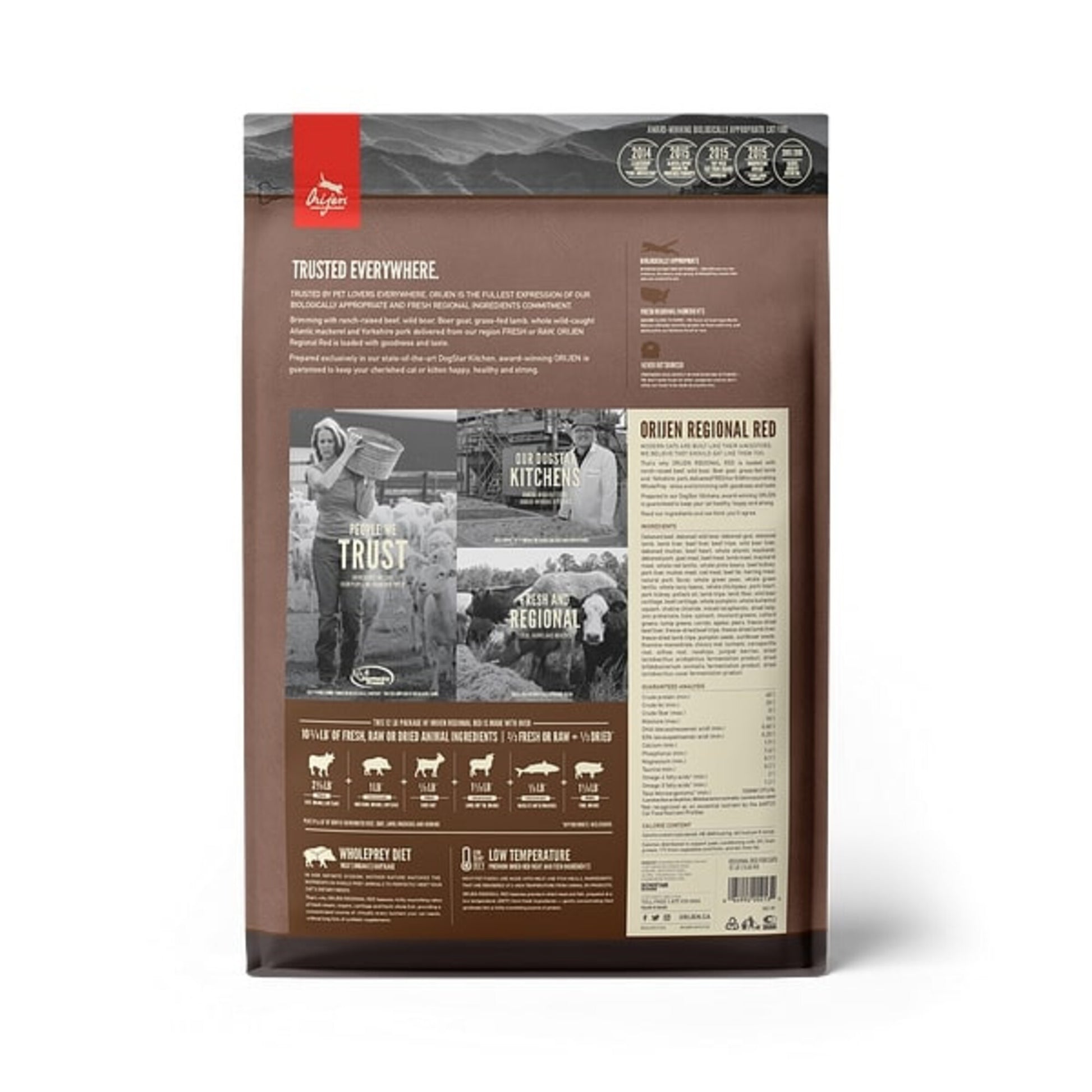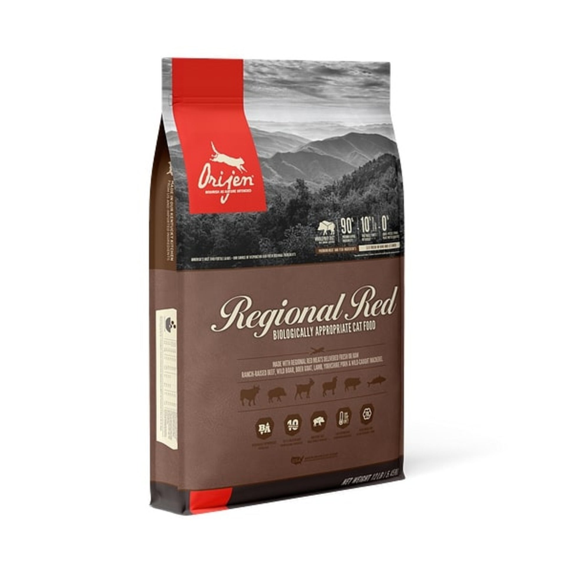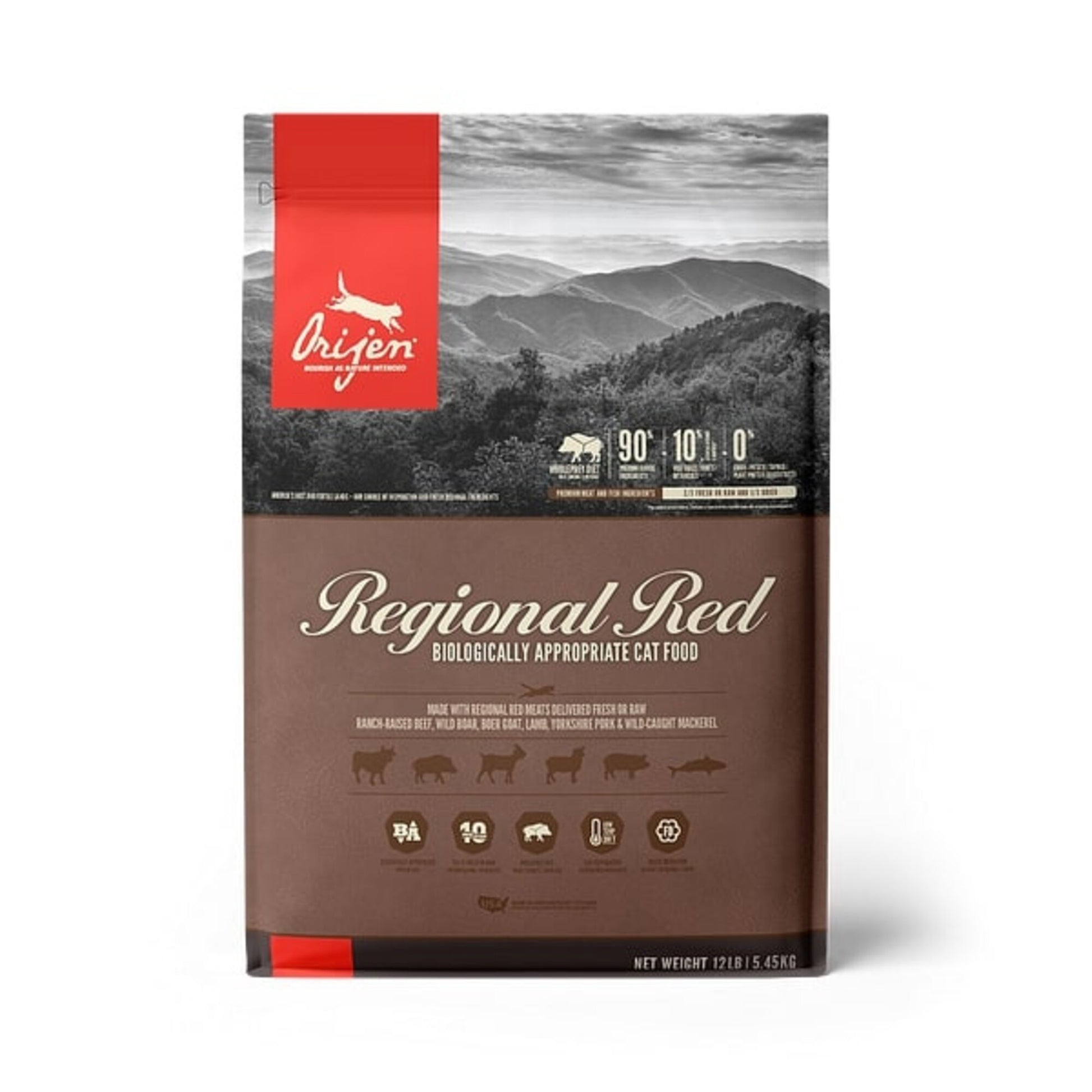 ORIJEN Regional Red Dry Cat Food is an unmatched diversity of red meats that mirror the freshness and variety that your cat is evolved to eat. Brimming with 40% rich protein from angus beef, wild boar, boer goat, romney lamb, yorkshire pork and wild mackeral, and limited to 20% low-glycemic carbs, ORIJEN Regional Red nourishes your cat's evolutionary need for high quality fresh protein. 90% of Regional Red is high quality red meats and fish, with 15% vegetables, fruits and healthy botanicals, with 0% grains, potato, tapioca or plant proteins. The Meat Math is simple - more fresh, human grade high quality proteins, with zero grains, fillers or potato, the better the cat food. And the better the dog food, a happier and healthy cat.