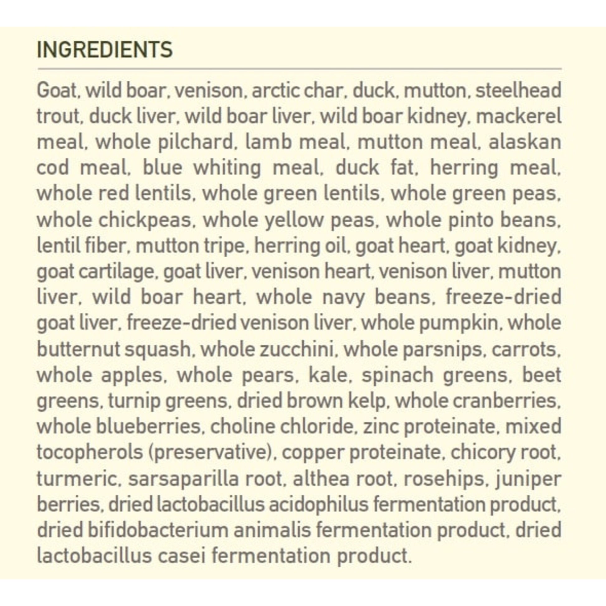 -90% quality animal ingredients from goat, wild boar, ranch-raised venison, Arctic char, free-run duck, and grass-fed mutton, including meat, organs, cartilage, and edible bone for complete and balanced nutrition