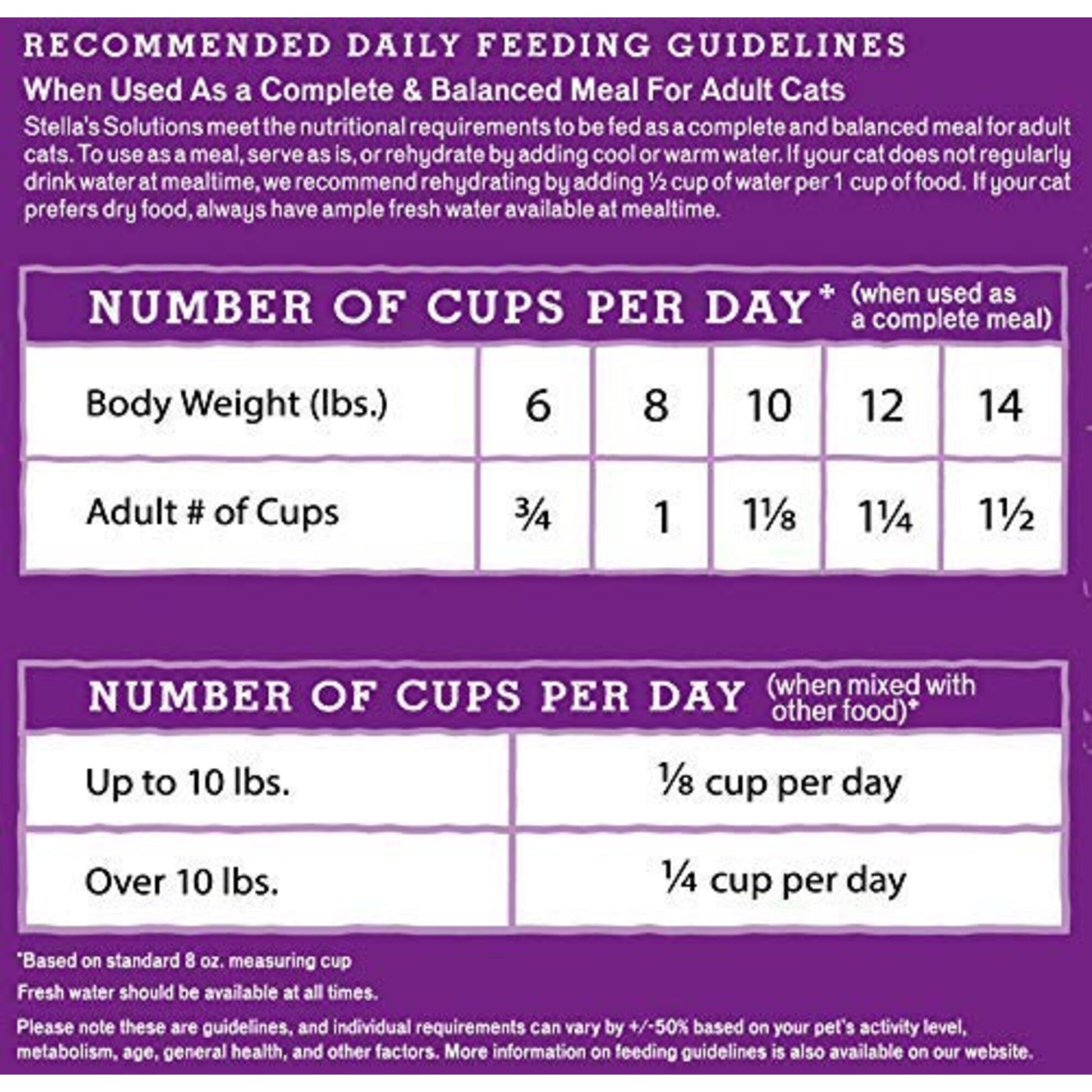 When used as a complete & balanced meal for adult cats: Stella's Solutions meet the nutritional requirements to be fed as a complete and balanced meal for adult cats. To use as a meal, serve as is, or rehydrate by adding cool or warm water. If your cat does not regularly drink water at mealtime, we recommend rehydrating by adding 1/2 cup of water per 1 cup of food. If your cat prefers dry food, always have ample fresh water available at mealtime. Number of cups per day* (When used as a complete meal): Body Weight (lbs.) Adult # of Cups 6 3/4 8 1 10 1 1/8 12 1 1/4 14 1 1/2 Number of cups per day* (When mixed with other food) Up to 10 lbs. 1/8 cup per day Over 10 lbs. 1/4 cup per day *Based on standard 8 oz. measuring cup Please note that these are guidelines, and individual requirements can vary by +/- 50% based on your pet's activity level, metabolism, age, general health, and other factors. More information on feeding guidelines is also available on our website.