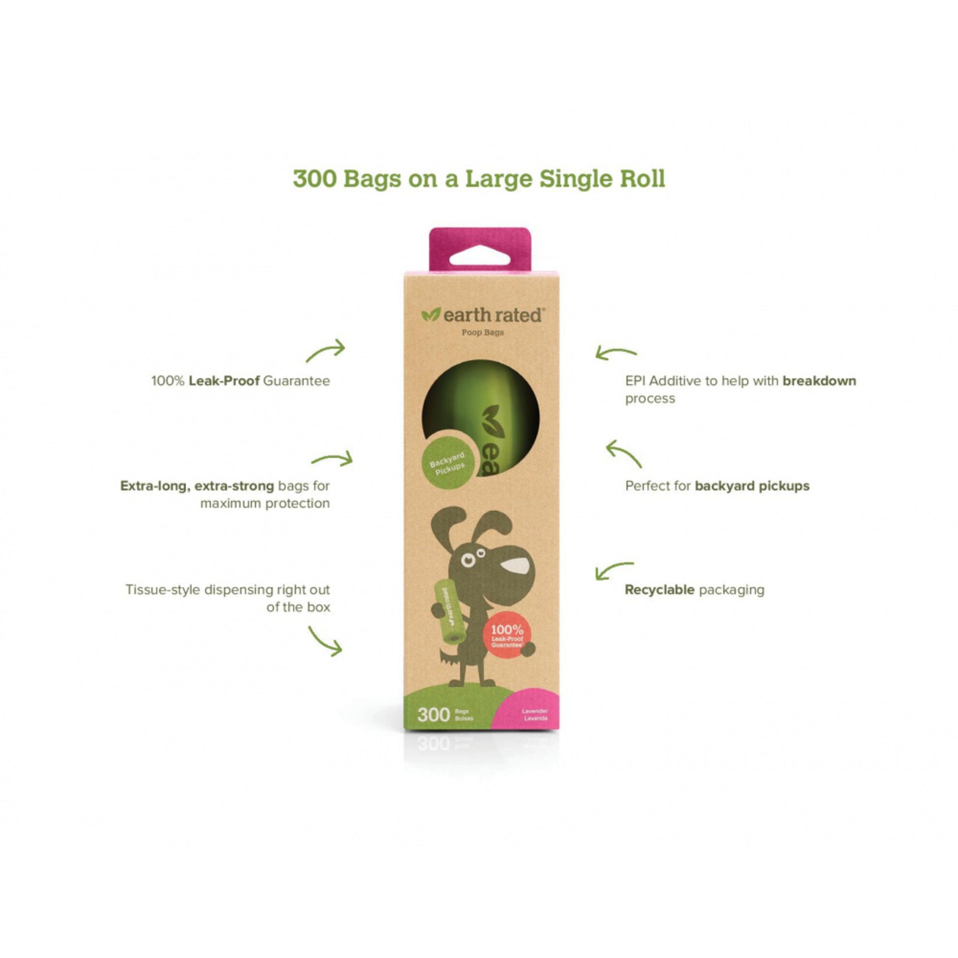 These 300 Earth Rated® value pack dog waste bags are conveniently packaged on a single roll in a box made of recycled content that dispenses one bag at a time. Lavender-scented, leak-proof and extra strong, they can hold any size poop and fit perfectly in your pantry. Earth Rated® products are the industry leader in terms of quality, and most of all, affordability. At Earth Rated®, we don't leave out the littlest of details - even our rolls' cores and packaging are made from recycled content!