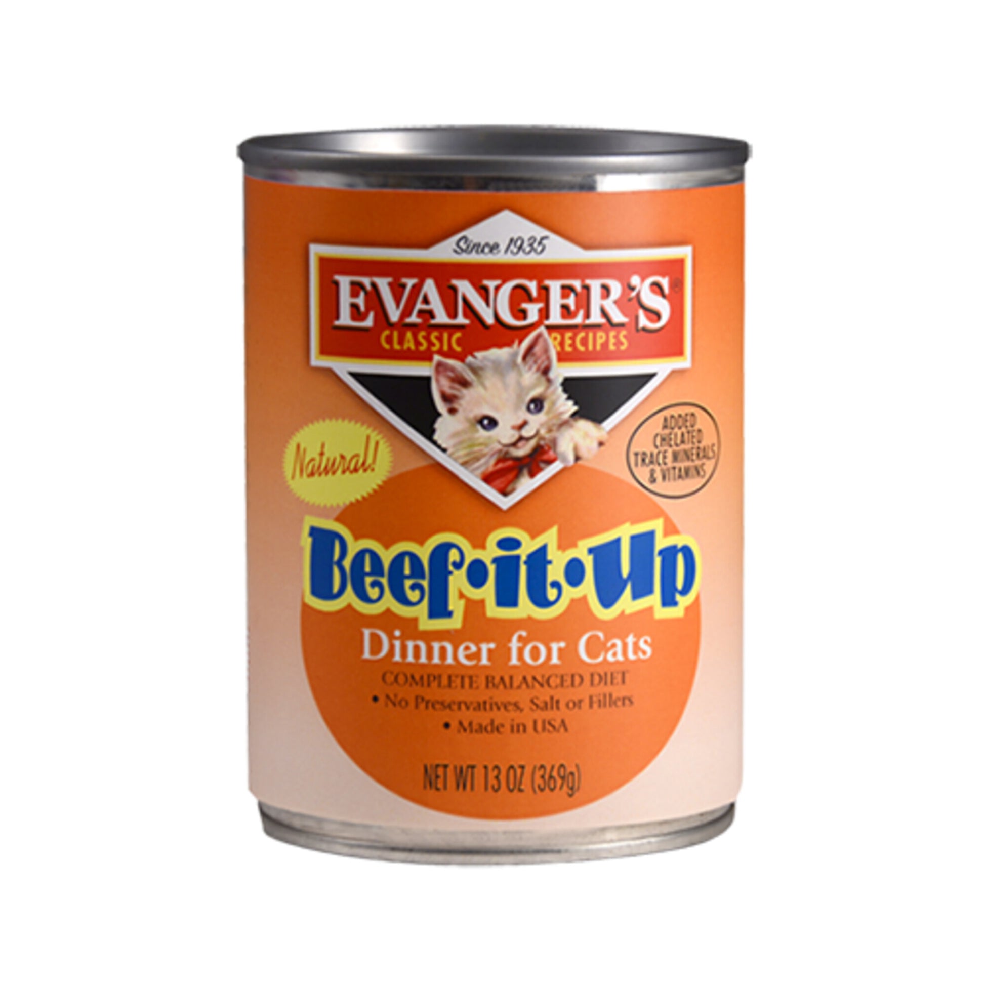 Evangers Beef It Up Canned cat food is specifically formulated to satisfy even the most finicky of eaters. This dinner is a complete diet that has tasty, fresh beef, liver and fish. There is no additives, preservatives, artificial color, salt or by-products. Cats love this great tasting formula!