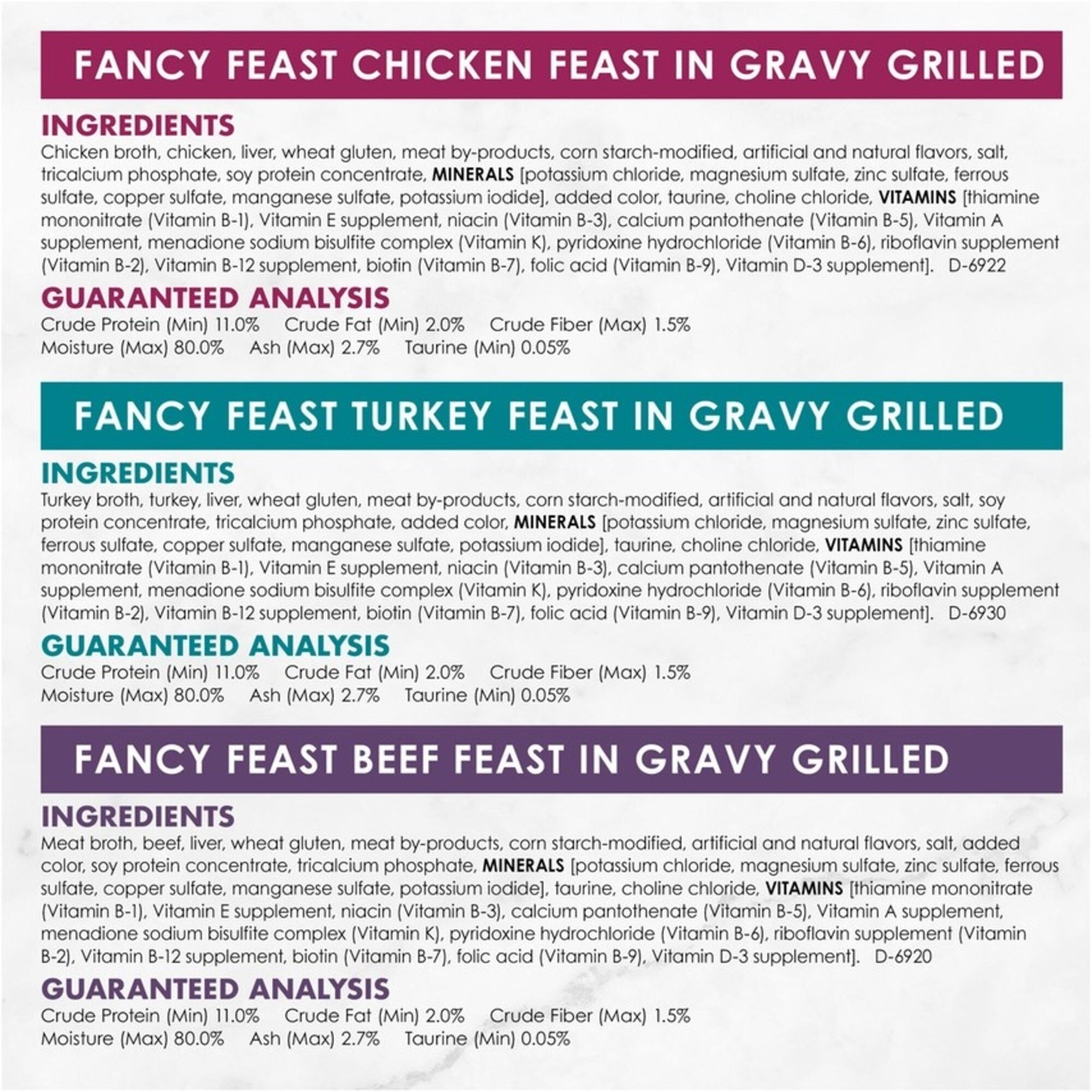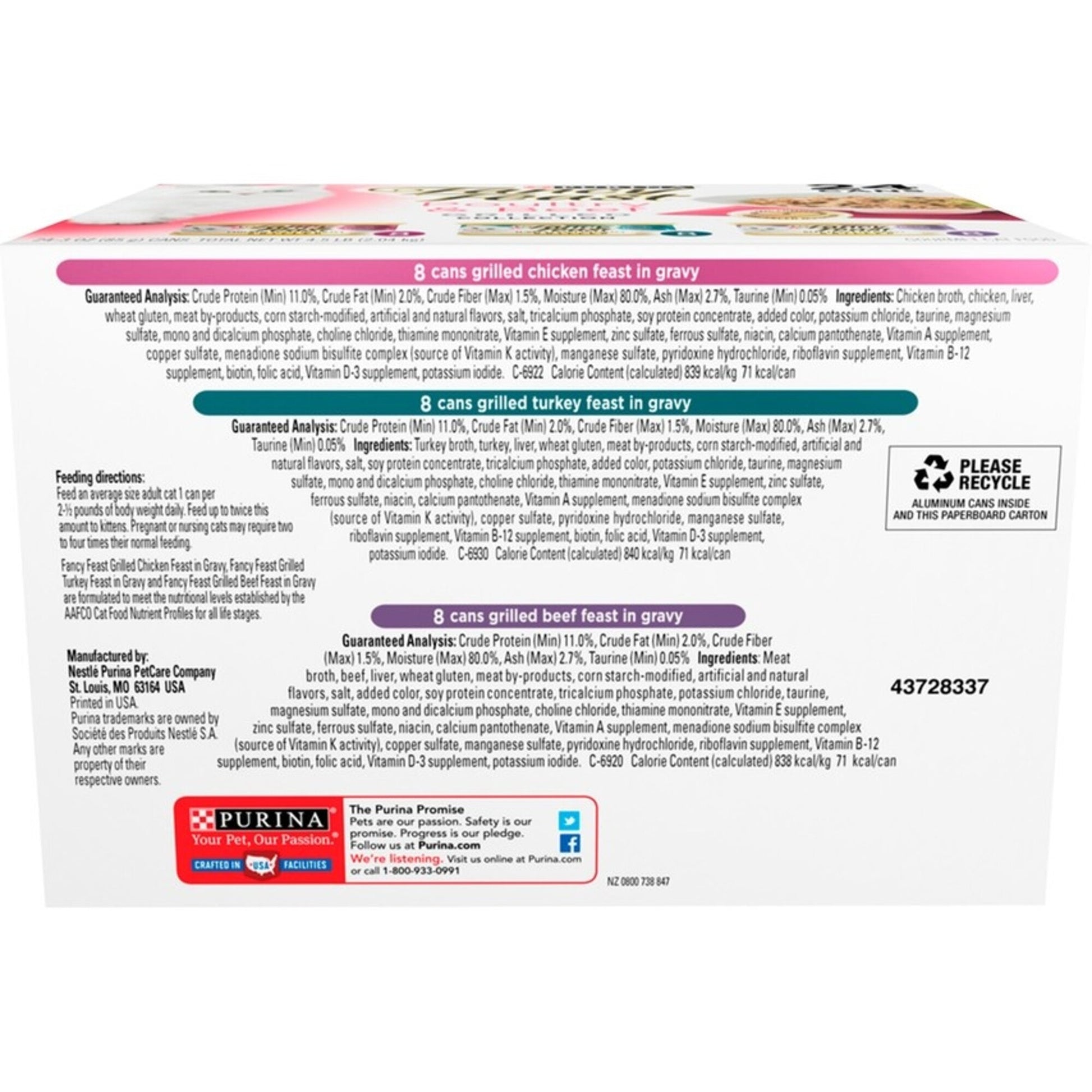 Indulge your cat's cravings for gourmet entrees when you offer up Purina Fancy Feast Grilled Poultry & Beef Collection wet cat food. This package contains Fancy Feast Grilled Chicken Feast in Gravy, Grilled Turkey Feast in Gravy and Grilled Beef Feast in Gravy, making it easy to change things up at mealtime to keep her excited about feedings. With 100% complete and balanced nutrition for adult cats in each serving, this wet cat food collection lets you keep her health at the top of your priority list while still giving her the tastes cats love. The tender texture of the slow-cooked meaty morsels gives her something to look forward to every time she hears you open a can of this Fancy Feast gourmet wet cat food. For over 30 years, we've been committed to creating ultimate delight for cats, balancing nutrition with flavor and presentation for quality canned cat foods, dry foods and treats for special times. We make quality the #1 ingredient in everything we do, and we strive to meet or exceed government standards for pet food, so you can feel confident every time you fill her dish with this gourmet wet cat food. This Fancy Feast collection is proudly crafted in our U.S. facilities to give you added peace of mind, and our staff performs hourly quality and safety checks throughout the production process. The result is delicious, high-quality food for your beloved cat. We know that life is better with pets, which is why we're constantly looking for ways to improve our recipes with results-based research that makes a delicious, nutritious adult cat food. Sustainability is a core concept for Purina pet foods, and we see that through by working toward a commitment to responsible sourcing and eco-friendly packaging. That's why each can in this canned cat food 24-pack is conveniently recyclable. Offer up a serving of Purina Fancy Feast Grilled Poultry & Beef Collection wet cat food, and give your cat the gourmet experience she truly deserves.