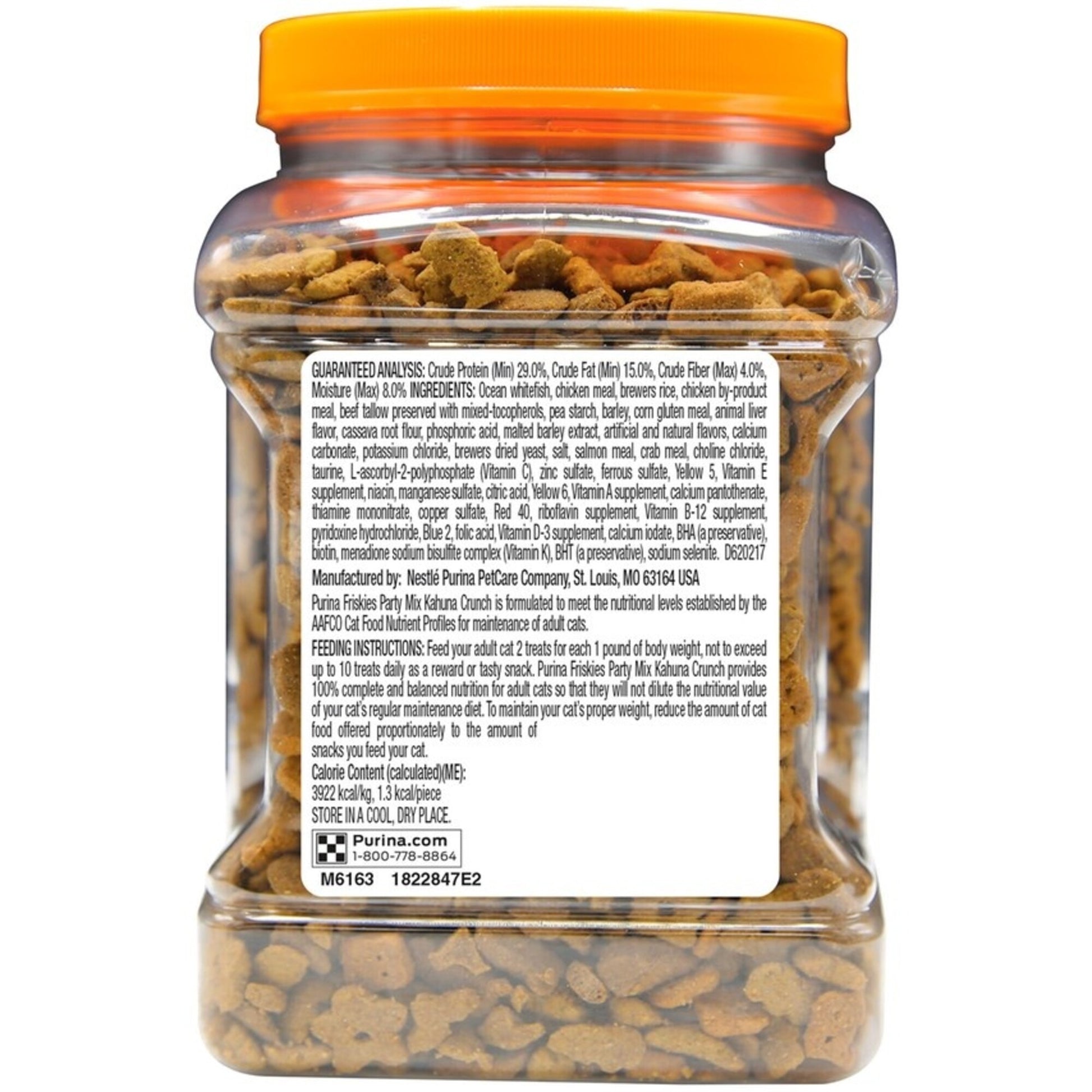 Watch your favorite feline's excitement as soon as you open a pack of Purina Friskies Party Mix Kahuna Crunch adult cat treats. Providing 100% complete and balanced nutrition for adult cats, these treats contain real ocean whitefish as the #1 ingredient alongside with flavors of salmon and crab for the mouthwatering seafood experience she loves. Fun, playful shapes keep her interested in each adult cat treat you offer her, and the crunchy texture helps clean her teeth, giving you a sense of satisfaction every time she smiles. Follow the feeding instructions on the pouch, reducing the amount of her regular food proportionately to the number of treats you offer her each day. To provide some variety, try our other Purina Friskies Party Mix recipes, including Purina Friskies Party Mix Treasure Island Crunch adult cat treats. Capture her attention when you reach for Purina Friskies Party Mix Kahuna Crunch adult cat treats. She gets the delectable seafood flavors cats love, and you get the peace of mind that comes from knowing that every high-quality treat is backed by Purina's more than 90 years of innovation pushing pet nutrition forward. This recipe is crafted in our Purina-owned U.S. facilities, where quality is always the top priority. We perform regular quality and safety checks to fulfill our commitment to pet parents like you. Tempt your furry friend's taste buds every day when you feed her from our complete line of Purina Friskies wet and dry cat foods, treats and cat food complements. You love making happy memories with her, and when you open a package of Purina Friskies Party Mix Kahuna Crunch adult cat treats during afternoon snuggles, you can share in her delight while feeling confident in the high-quality ingredients backed by the Purina name.