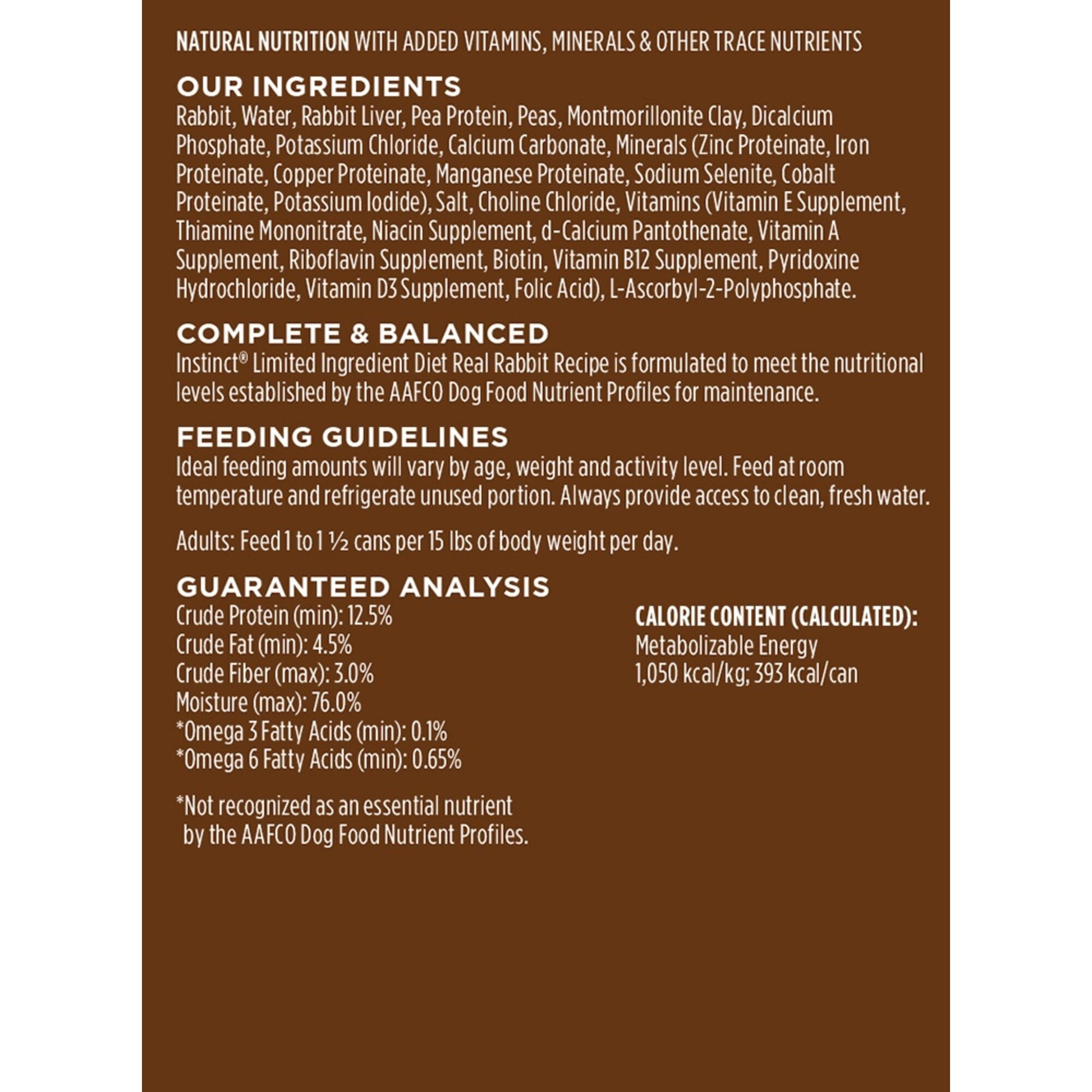 Sensitive digestive systems can be difficult to manage. Nature's Variety is here to help, with Instinct Grain-Free LID Rabbit Canned Dog Food. Made with one single animal protein, high quality rabbit, and highly digestible, simple ingredients, feel good knowing your dog is eating a simple, digestible diet. Free of grains and gluten for extra digestibility, and balanced for all life stages, Instinct LID features only recognizable ingredients in grain-free formulas.