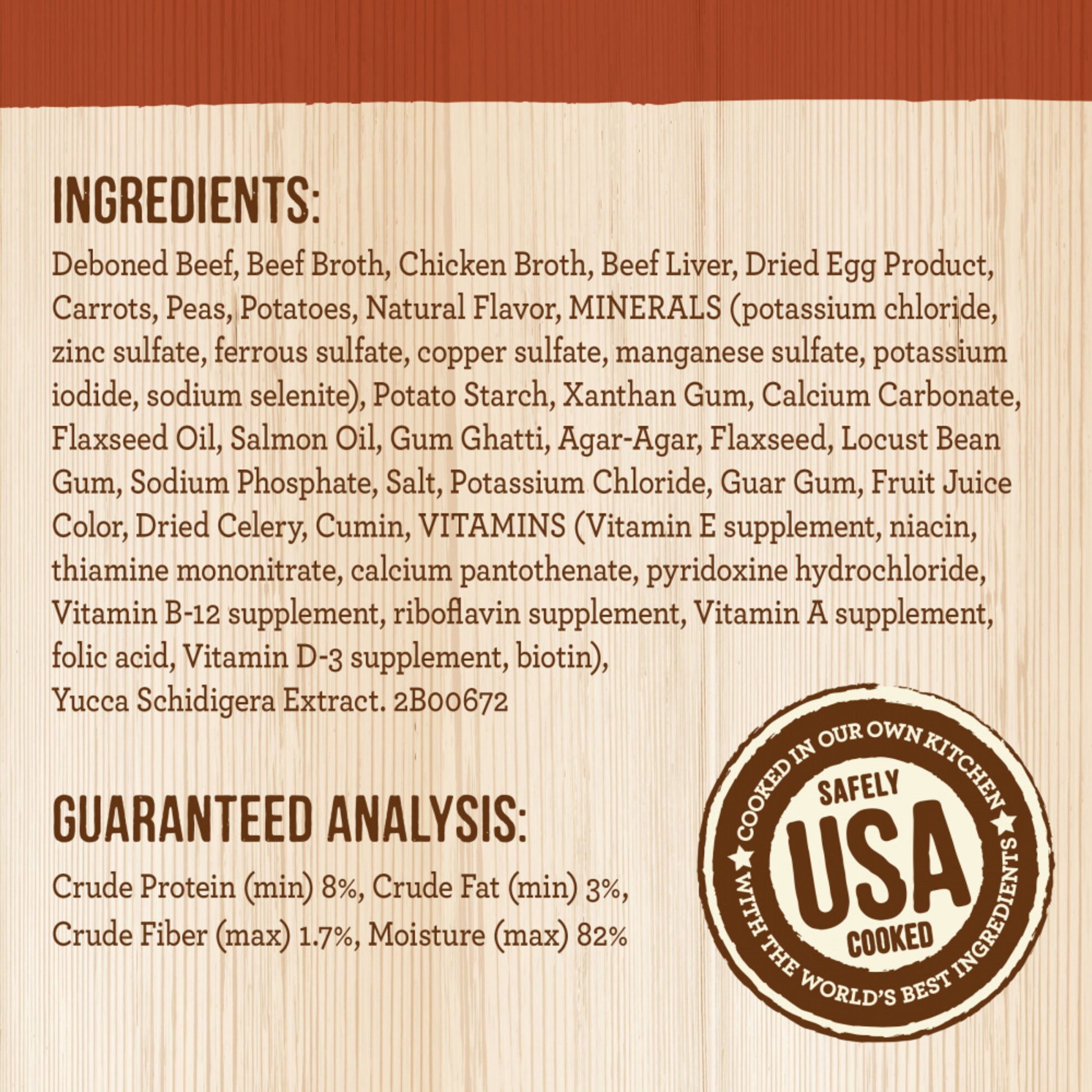 The first ingredient in Merrick Grain Free Wet Dog Food Brauts-n-Tots is always real USDA-inspected deboned beef. This real beef dog food recipe also contains real peas, potatoes and carrots to lend wholesome goodness and variety to your dog's menu. A savory dog food gravy made with beef broth adds even more flavor and moisture to daily meals. To meet your dietary preferences, this grain free wet dog food with vegetables contains no artificial colors, flavors, preservatives or by-products. Use this Merrick moist dog food recipe as a topper for your dog's dry kibble, or serve it as a nutritious standalone meal. A convenient pull-tab can makes preparing your dog's meal quick and easy. Like all Merrick recipes, Brauts-n-Tots was crafted in our Hereford, TX kitchen and cooked in the USA.
