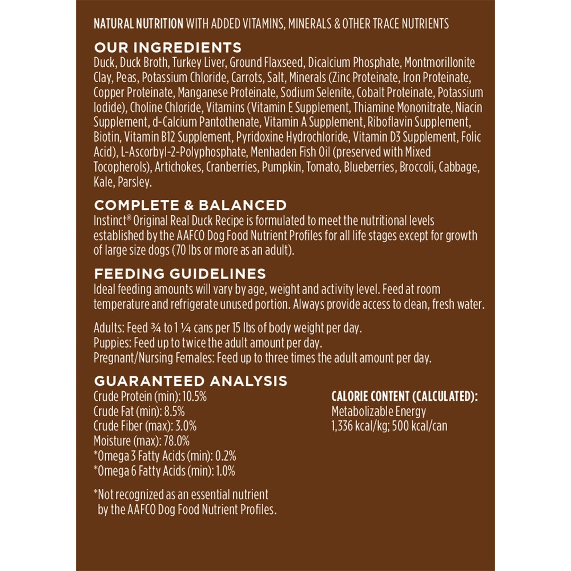 With Instinct Grain-Free Duck Formula Canned Dog Food, your dog will enjoy the hearty benefits of wholesome fruits and vegetables and high quality, real protein. Essential building blocks like omega fatty acids keep your dog's coat shiny and their skin healthy, while 95% real duck and turkey liver adds delicious flavor. Zero fillers like grain and gluten go into formulating this recipe, so you'll know your dog is getting optimal nutritional value from their food. Giving your dog a beneficial diet is easy with Instinct Grain-Free Duck Formula Canned Dog Food, plus it's ideal for dogs on rotational diets.