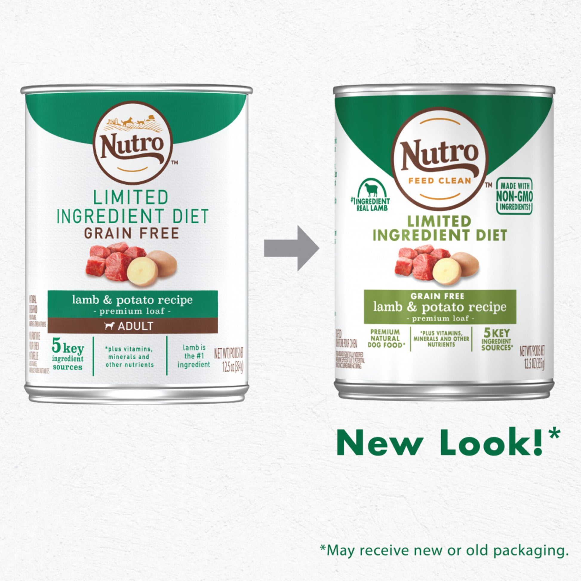 Your dog wont be able to resist getting their paws on a can of NUTRO Limited Ingredient Diet Lamb & Potato Recipe Adult Dog Food. Farm-raised lamb is the first ingredient in this wet food designed for dogs with food sensitivities. This grain-free canned dog food is made with natural ingredients plus vitamins, minerals, and other nutrients, and is full of flavor that canines big and small go crazy for. This NUTRO moist dog food recipe is made with non-GMO ingredients,* NO corn, wheat, or soy, NO chicken by-product meal, NO artificial preservatives, flavors, or colors. Plus, its made at facilities committed to zero waste to landfill. Give your dog NUTRO Limited Ingredient Diet recipes with the NUTRO FEED CLEAN logo every day for ultimate tail wags.