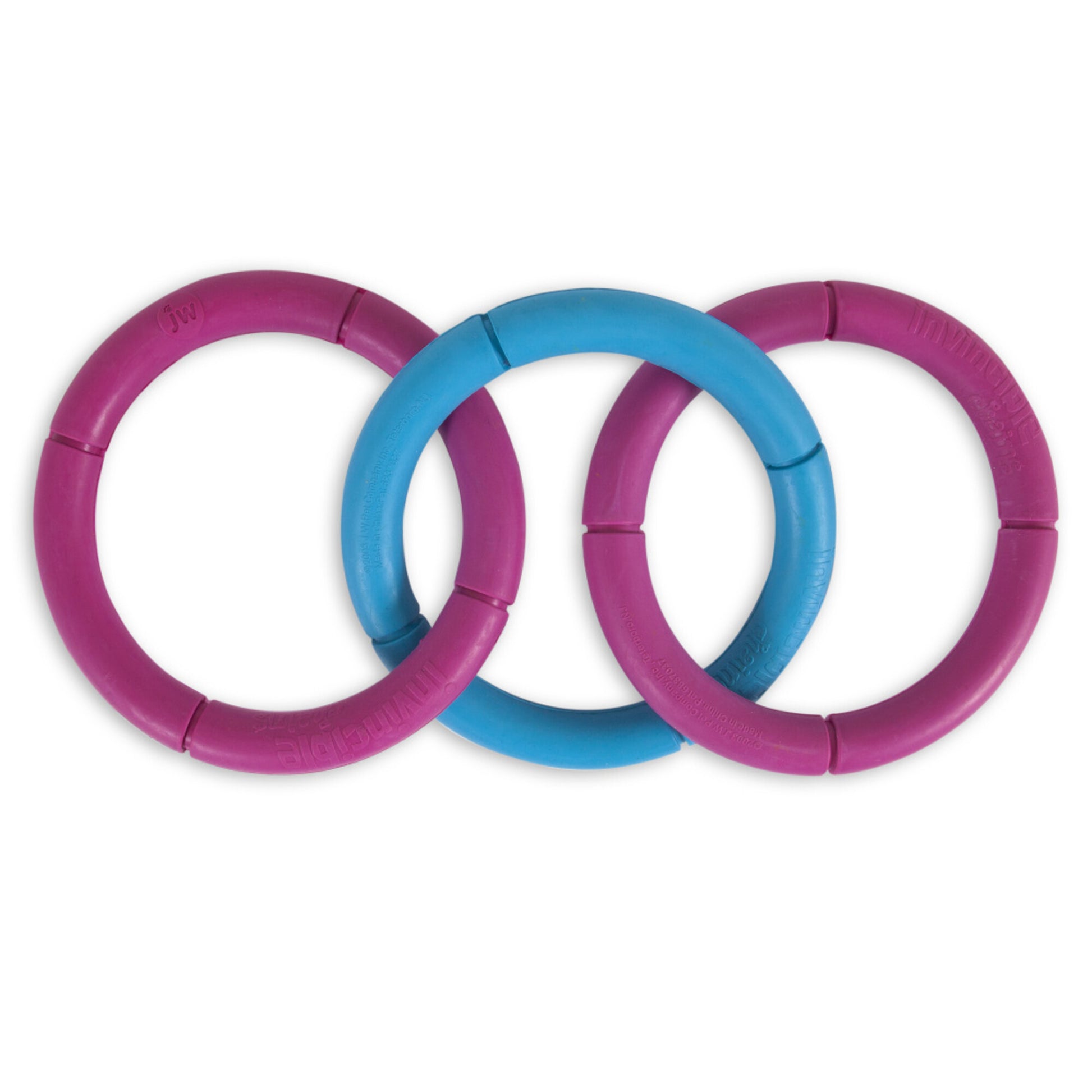 JW Invincible Chains provides your dog with the rubber texture he loves to chew on. Solid; no glue construction stands up to the abuse. A terrific tug as well - easy to hold on to while your dog tugs with all his or her might. Enjoy a game of toss and tug with this unique dog toy. Features include rubber rings with rope. Durable; great for interactive play; this JW dog toy is ideal for tug and fetch. Ships in assorted colors.