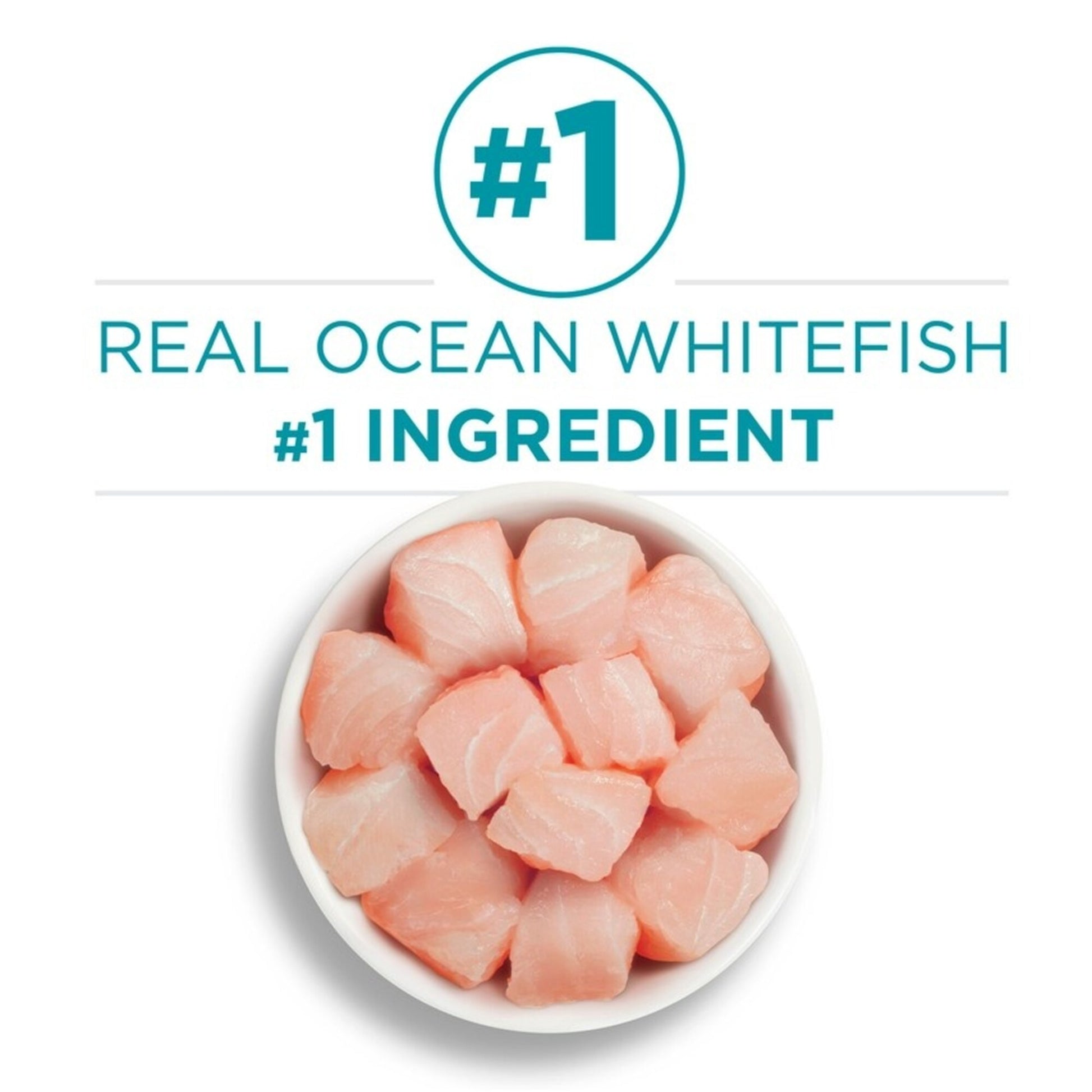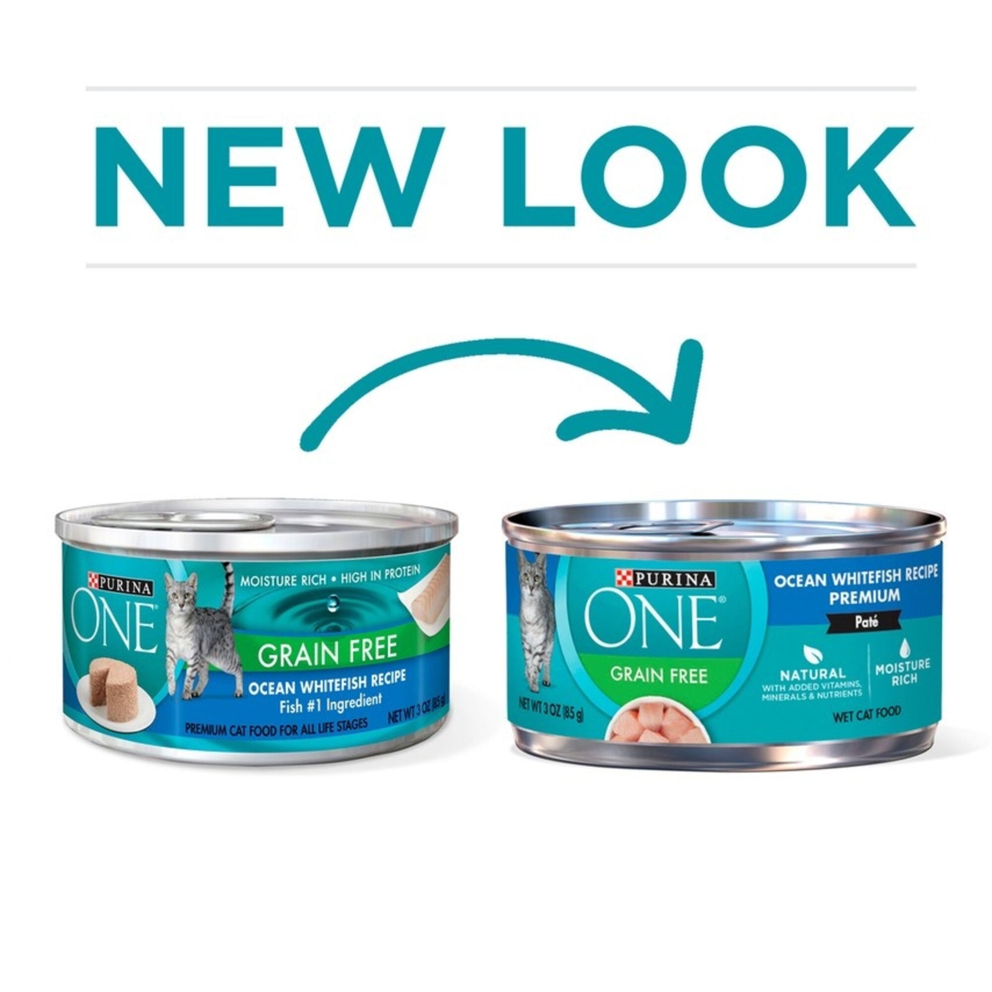 Give your cat a meal she can sink her teeth into when you serve Purina ONE Grain Free Ocean Whitefish Recipe Pate wet cat food. The smooth pate texture tempts her to her dish, and real fish as the #1 ingredient delivers mouthwatering seafood flavor. With omega-6 fatty acids to help support healthy skin and coat, this zero-grain wet cat food keeps her looking her very best. High protein helps support strong muscles, and the antioxidants in every serving give you one more reason to feel good about serving this recipe to your darling cat. This formula has no artificial colors, flavors or preservatives, along with 0% fillers, which means all of our high-quality ingredients have a purpose. Show her just how much you care about her overall health and wellness when you serve each Purina ONE grain-free cat food can, and take comfort in knowing she's getting purposeful nutrition for lifelong whole-body health. As a pet owner, you look for different ways to strengthen your bond with your cat, and this delectable wet cat food lets you do just that. Purina is committed to helping you and your cat get the most out of mealtime with targeted nutrition that meets her needs and a great taste she loves. That's why we strive to make quality our top priority in everything we do, and we formulate our foods to meet or exceed state and federal guidelines. She gets the taste she expects from a wet cat food along with the targeted nutrition you demand from a brand recommended by veterinarians. We proudly craft this Purina ONE grain-free cat food in our U.S. facilities, so you know where her food is coming from. In a typical 24-hour production, Nestle Purina conducts 30,000 quality checks involving ingredients, packaging, receiving, processing and packing, giving you added peace of mind every time you offer up a serving of Purina ONE Grain Free Ocean Whitefish Recipe Pate wet cat food.