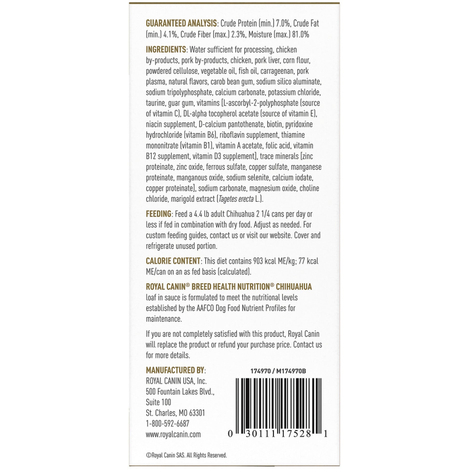 Royal Canin Chihuahua Loaf in Sauce wet dog food is tailor-made nutrition created just for your pure breed Chihuahua. Whether you have a deer head, apple head, fawn, or teacup, this exclusive breed-specific diet is uniquely formulated for your Chihuahua, with the specific nutrients to help them thrive. The complete, balanced, and aromatic soft dog food features a highly palatable paté to appeal to your Chihuahua’s appetite with moderately high fat and energy density. Contains EPA, DHA, and biotin to give your Chihuahua’s smooth or long coat a beautiful shine. And soluble and insoluble fibers support healthy digestion to promote optimal stool quality and reduce unpleasant stool odors. Mix in or complement with Royal Canin Chihuahua Adult or Adult 8+ dry dog food for extra reinforcement when it comes to fussy eaters.