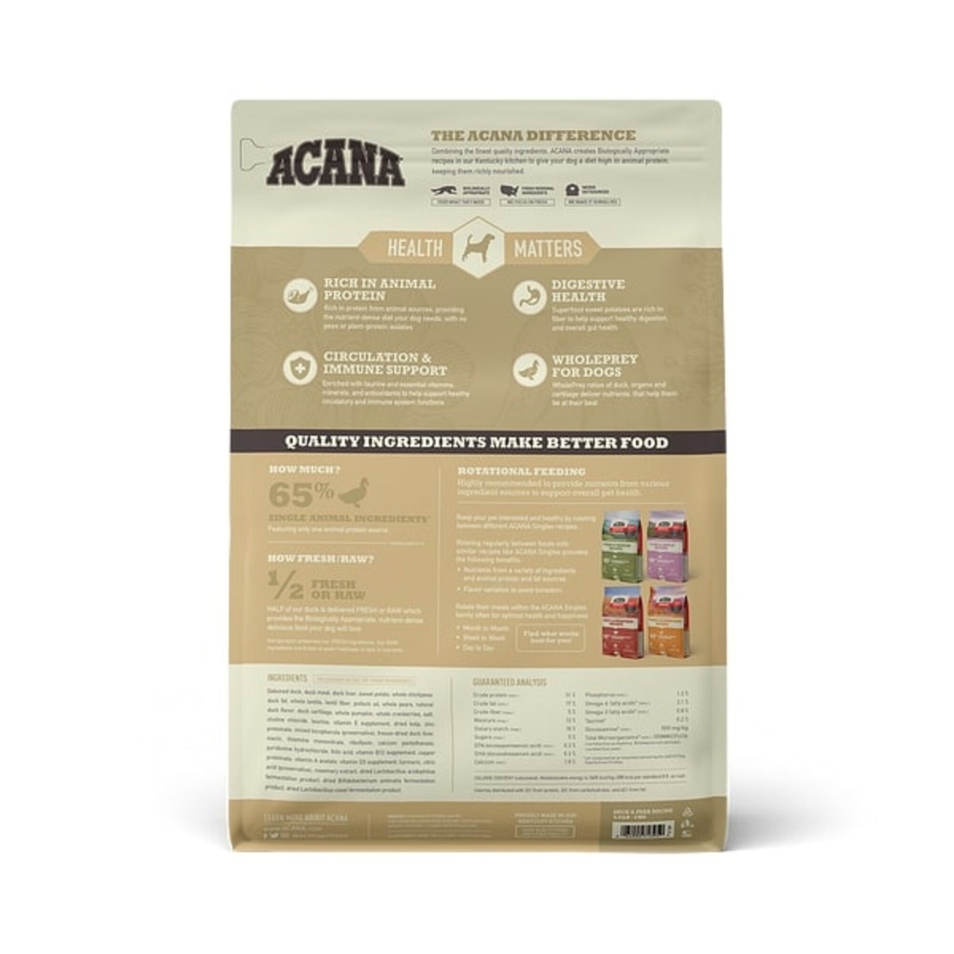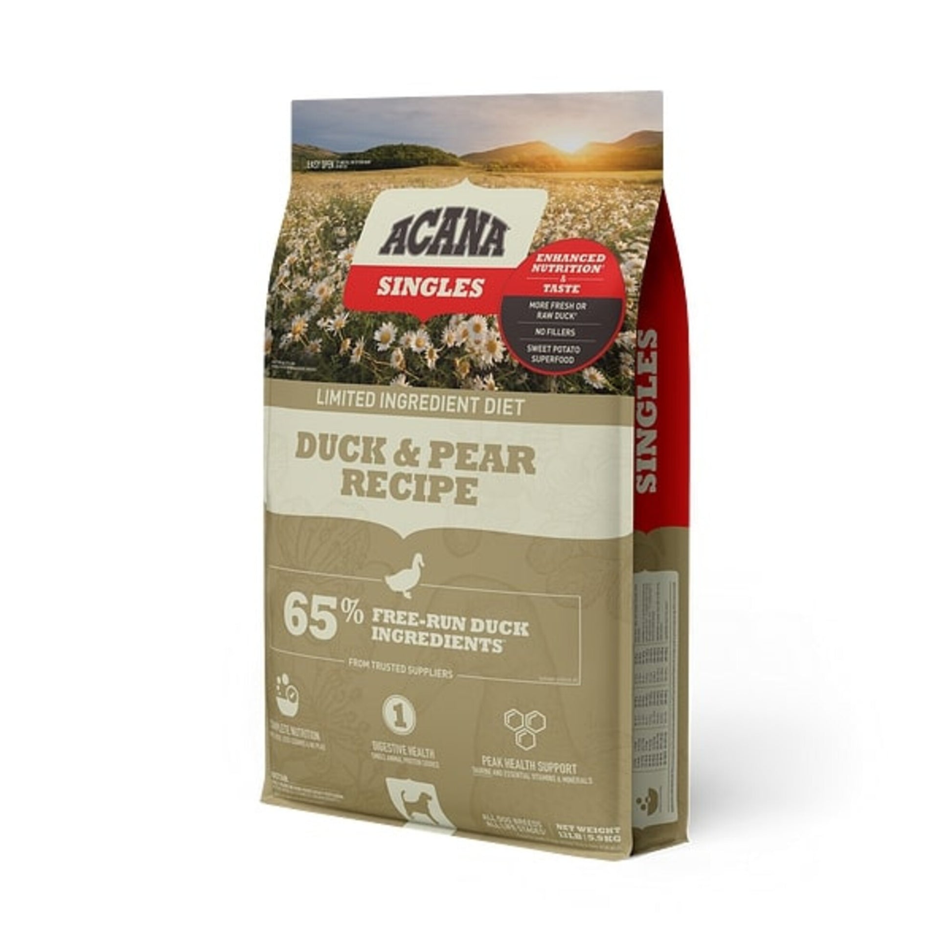 Limited ingredient doesn’t mean less meat. ACANA Singles Duck & Pear is loaded with 60% quality duck ingredients in WholePrey ratios of meat, organs, and cartilage, complemented with whole, delicious Bartlett pears, providing your dog with the protein and nutrients they need in order to stay happy, healthy, and strong.