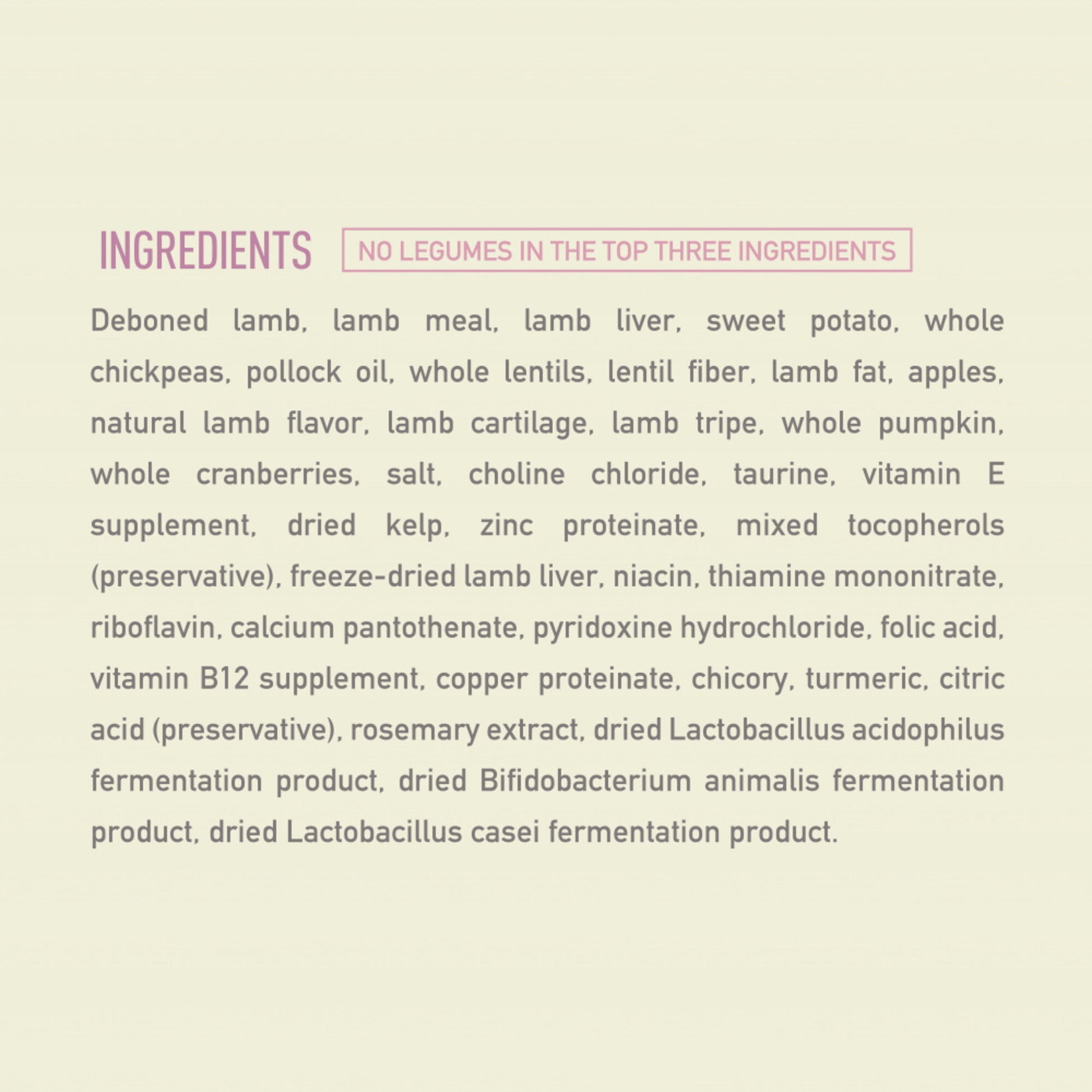 -60% quality lamb ingredients including meat, organs, and cartilage