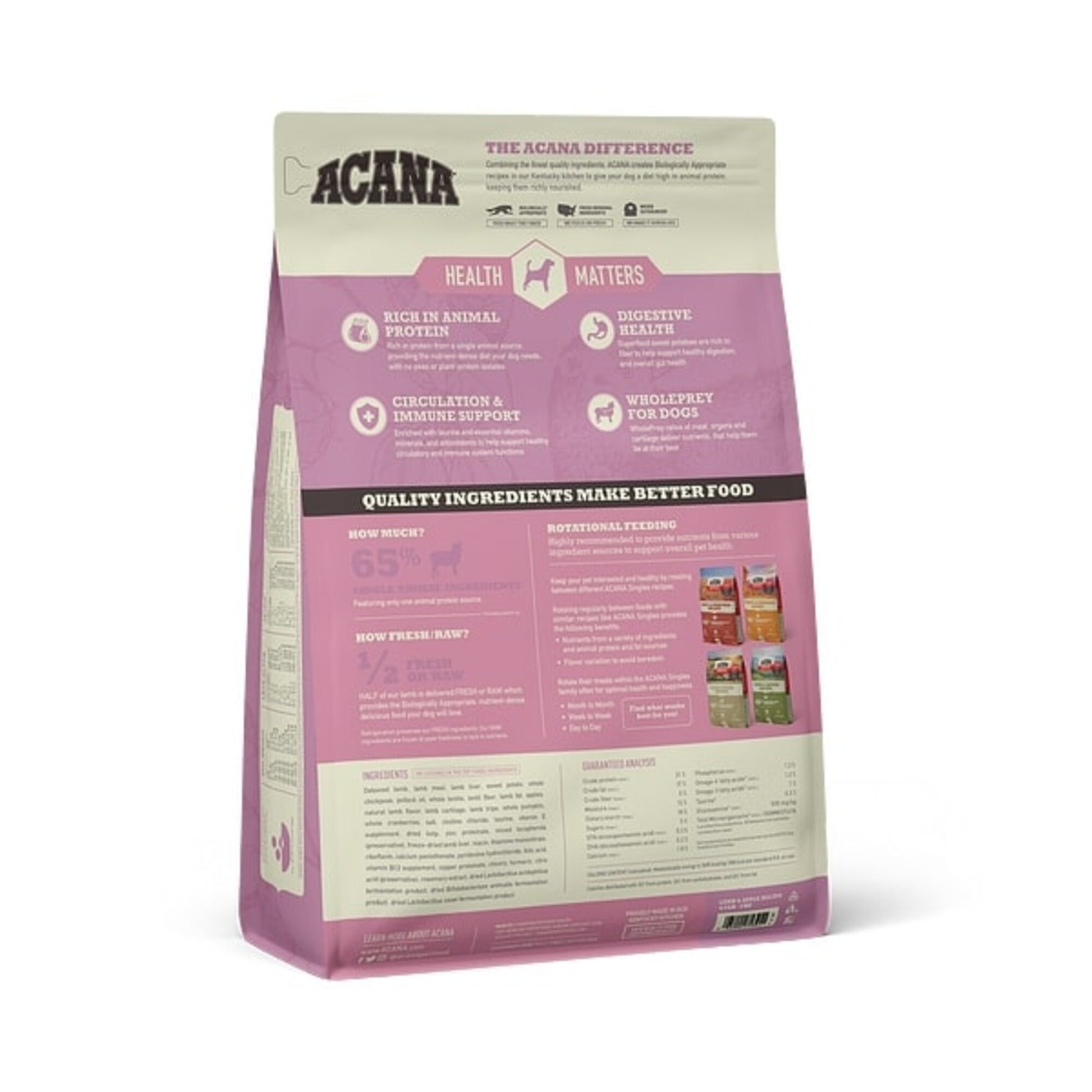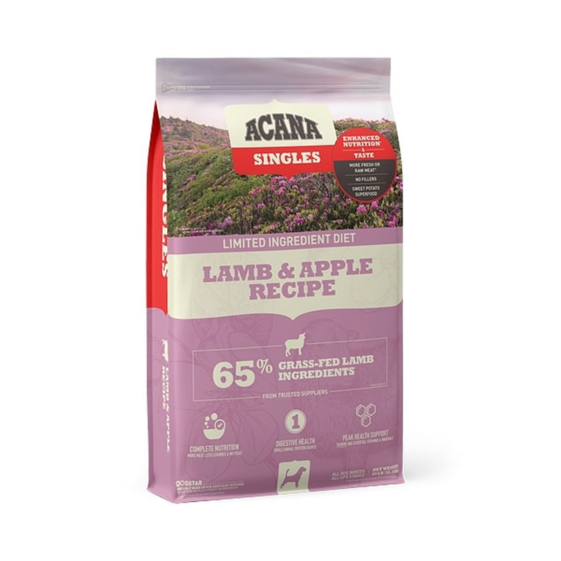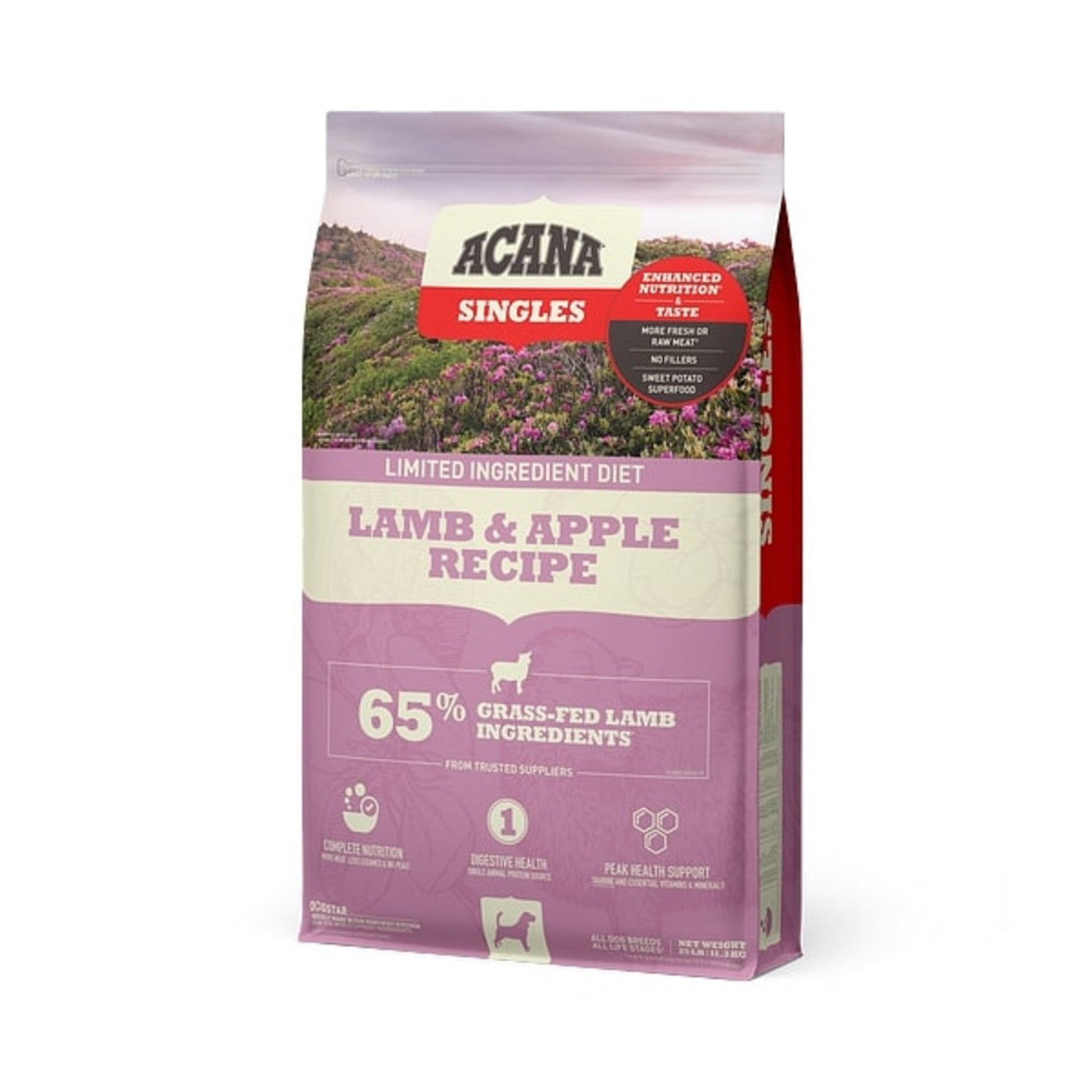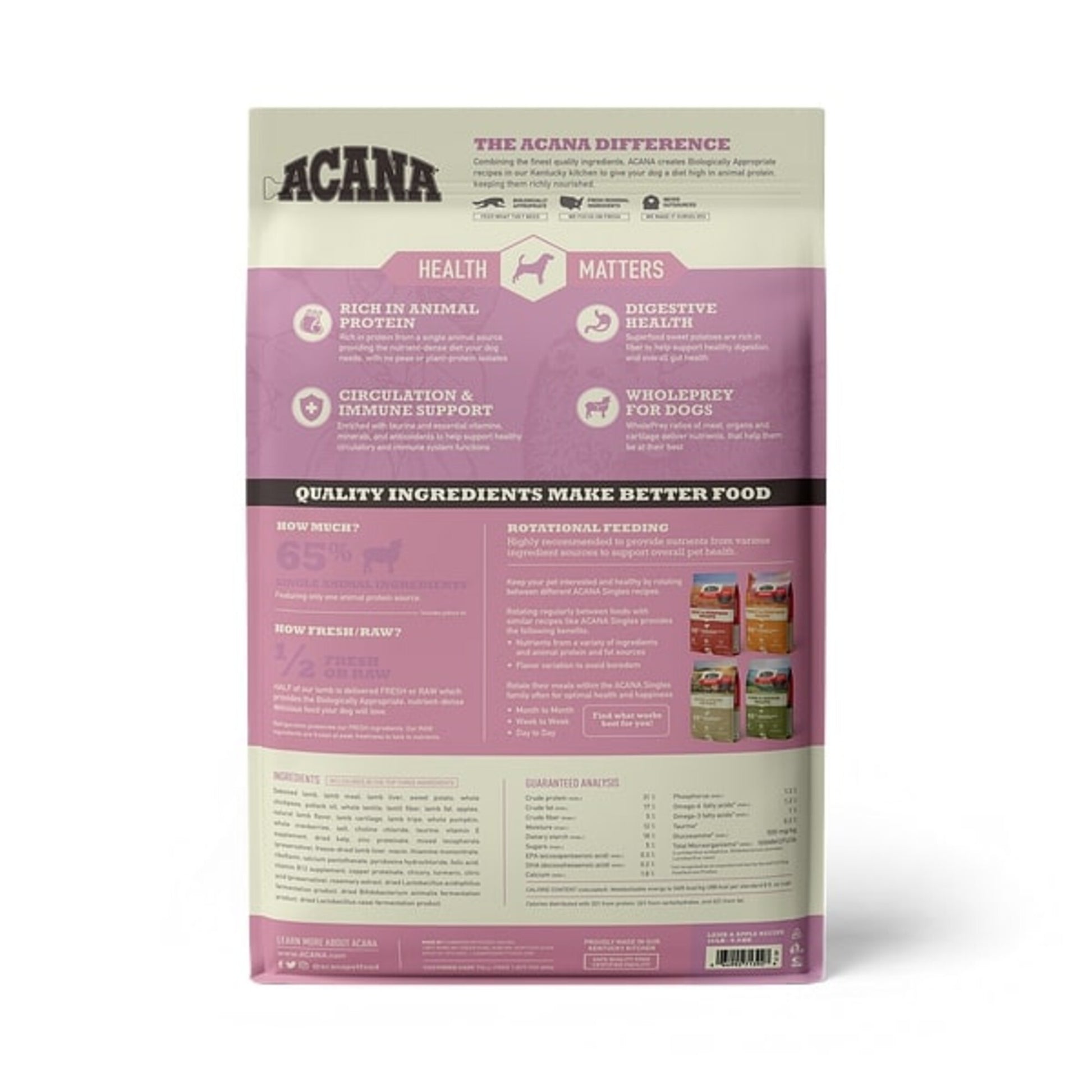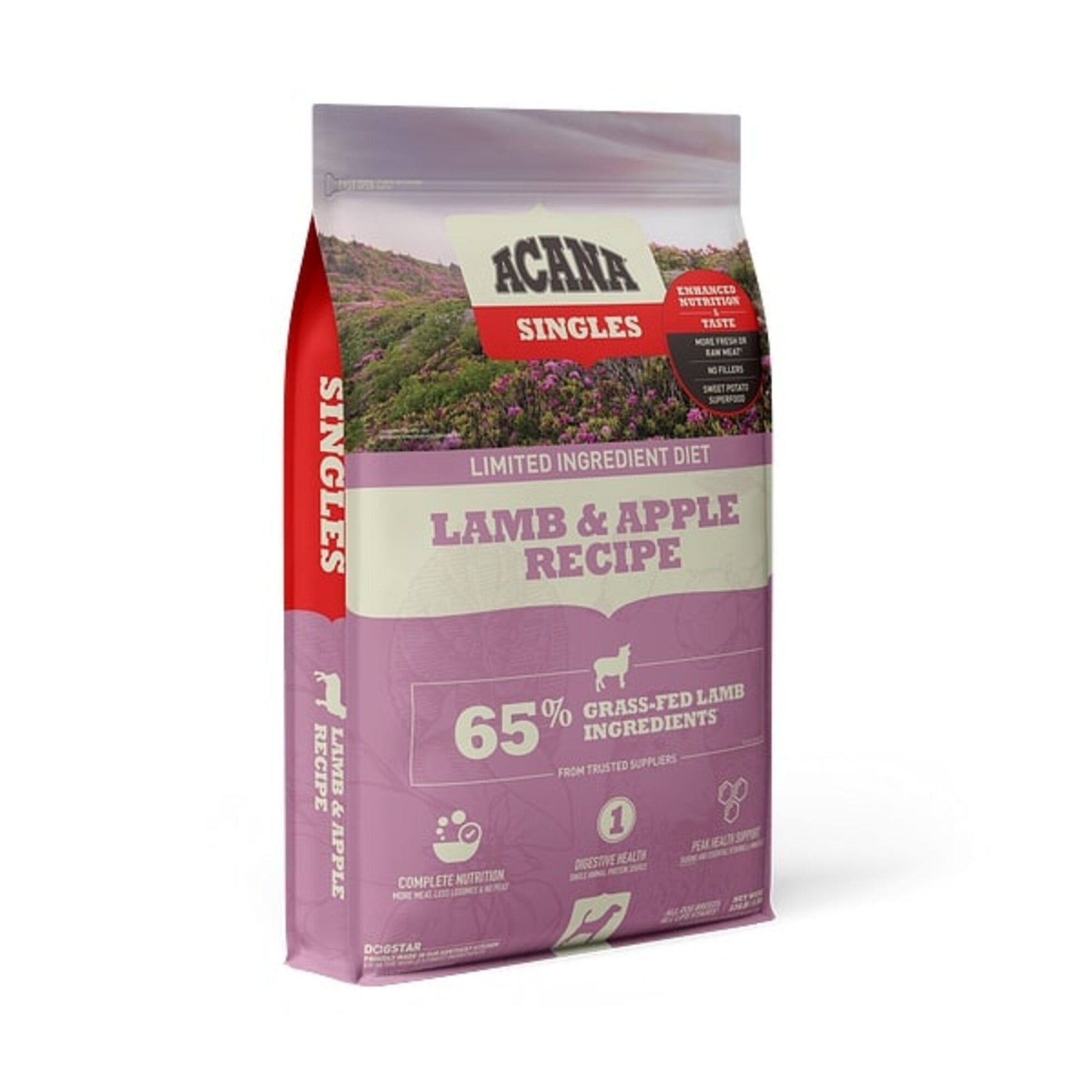 Limited ingredient doesn’t mean less meat. ACANA Singles Lamb & Apple is loaded with 60% quality lamb ingredients in WholePrey ratios of meat, organs, and cartilage, complemented with delicious, whole Red Delicious apples, providing your dog with the protein and nutrients they need in order to stay happy, healthy, and strong.