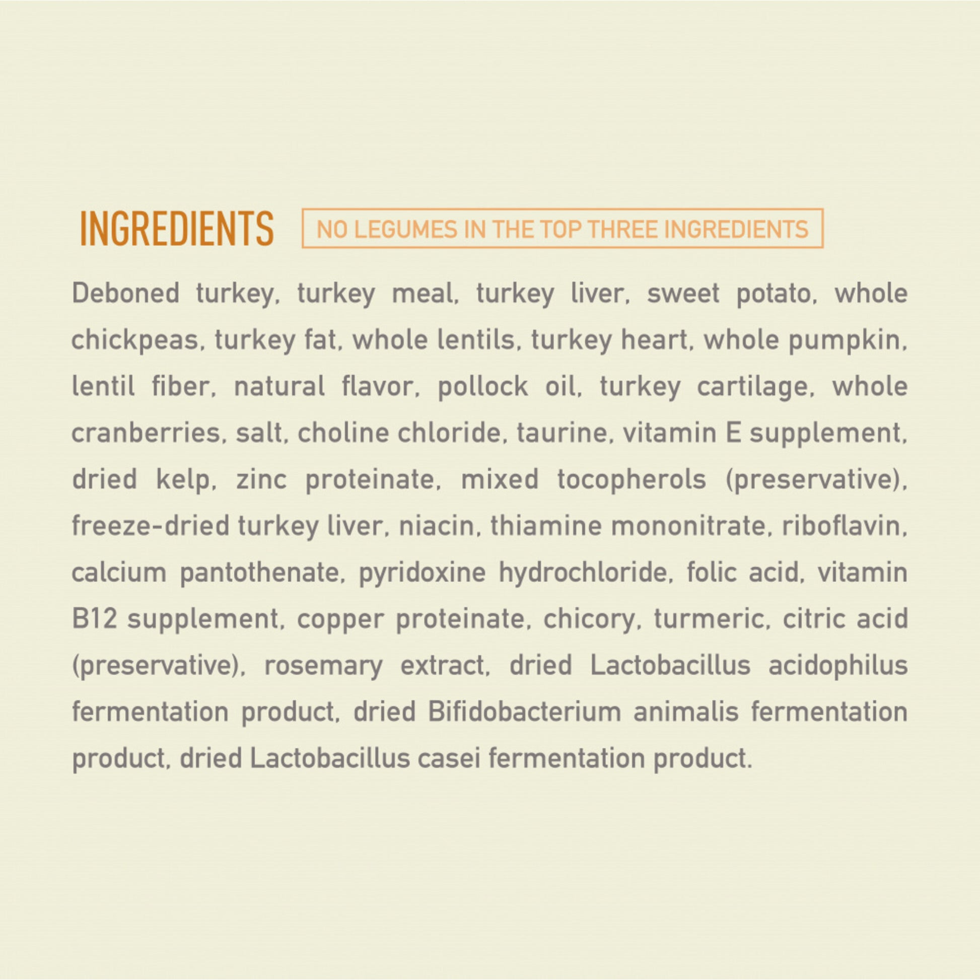 -60% quality turkey ingredients including meat, organs, and cartilage