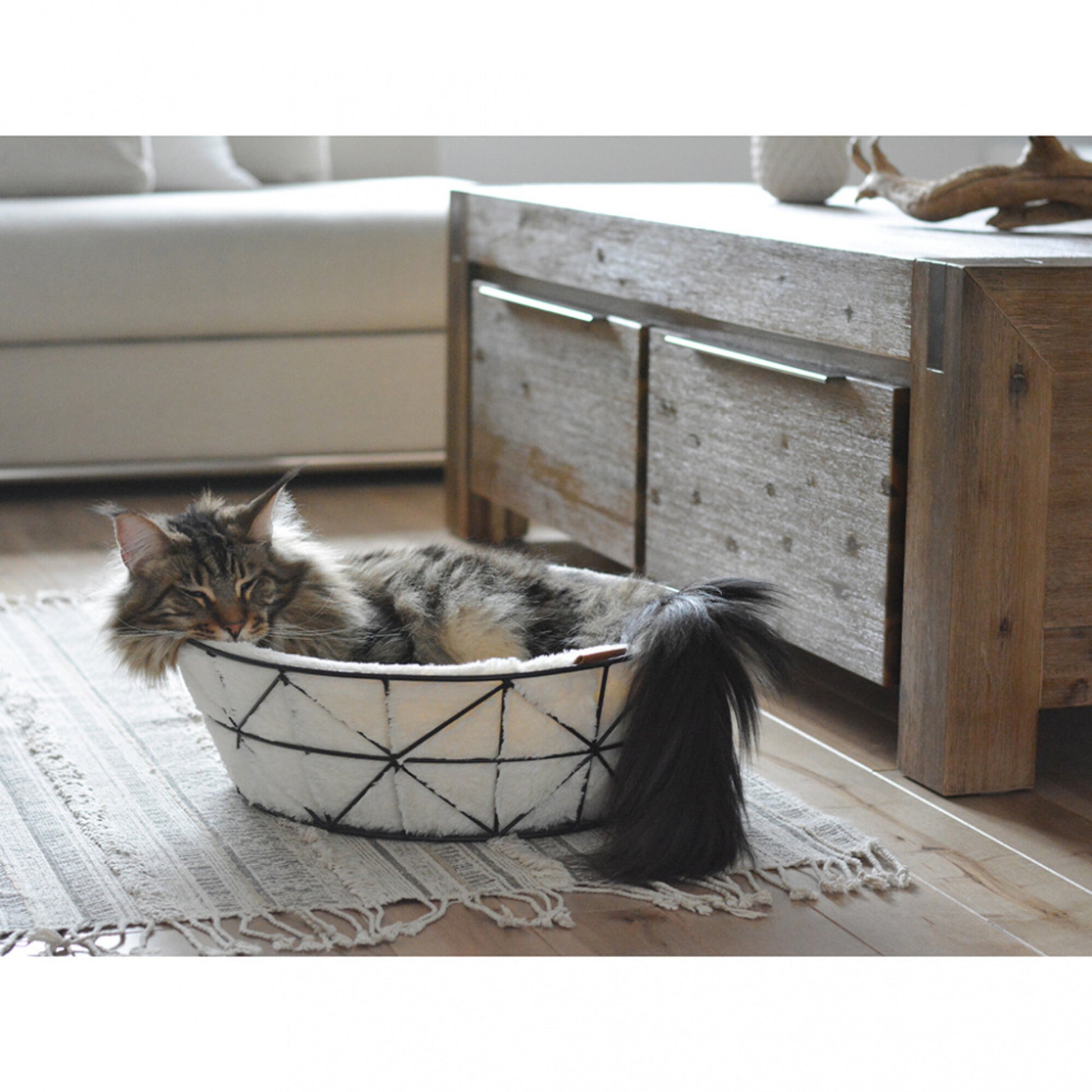 BeOneBreed metal basket for small cat. Soft cushion for maximum comfort and a cocoon effect. Neutral colors to match your home decor. Trendy geometric style. Round shape favoring the "rolled up" position that cats love. Quality products. Modern and cute pet accessories.Made in China