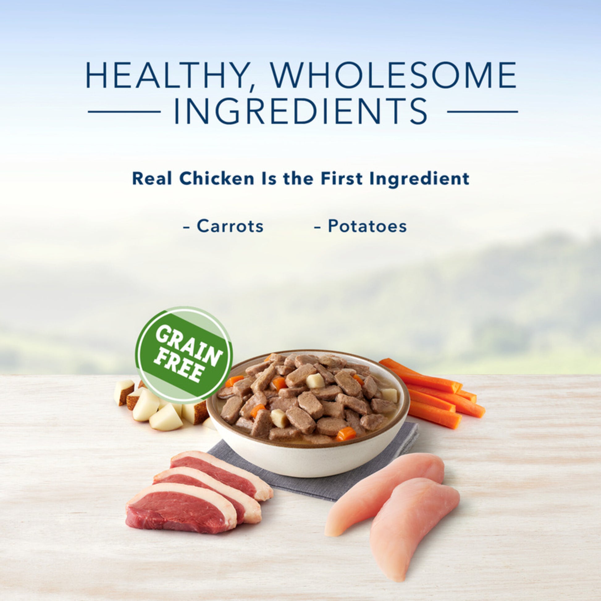 - REAL CHICKEN FIRST: This grain free wet dog food features high-quality protein from real chicken, turkey and duck to support healthy muscle maintenance