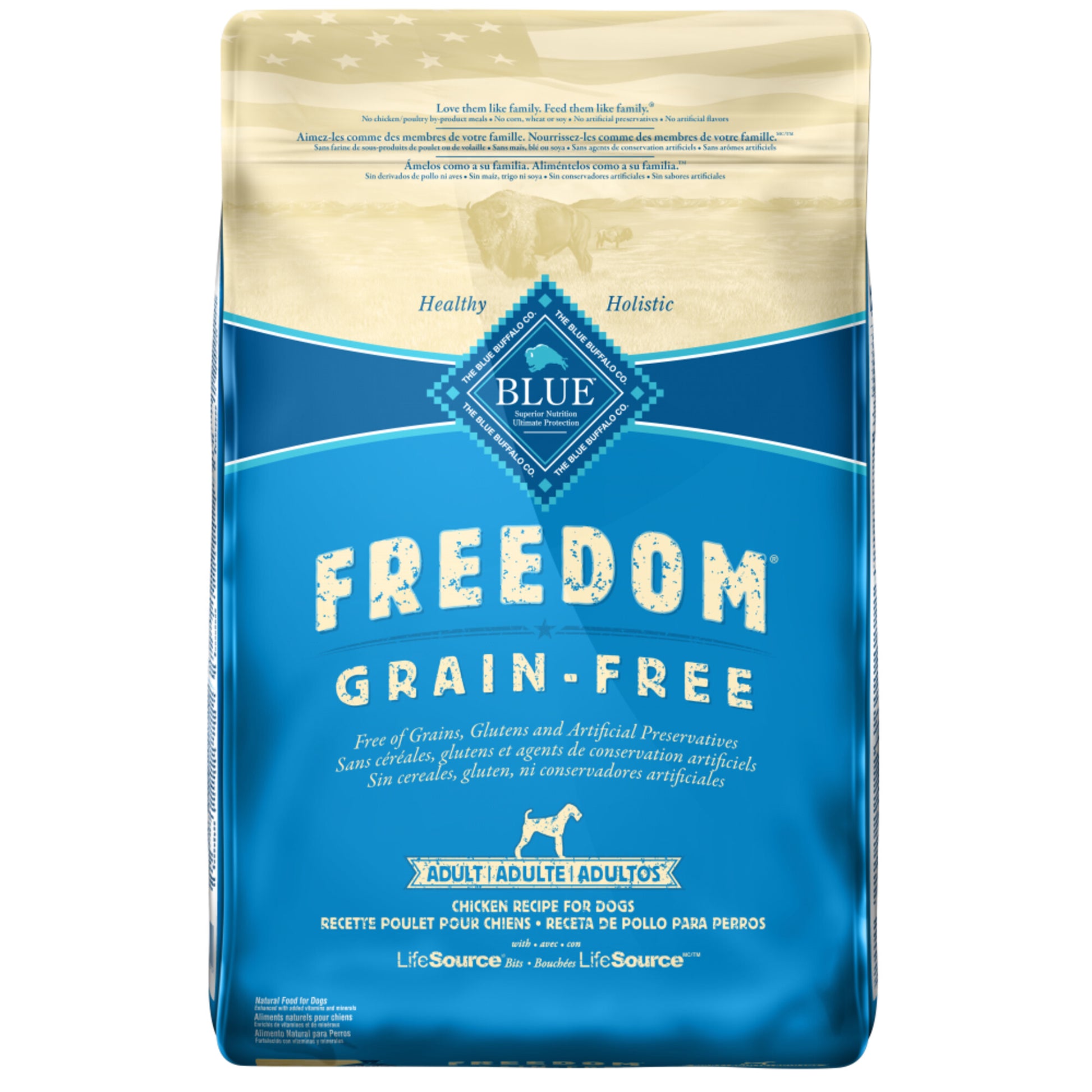 - GRAIN FREE DOG FOOD: BLUE Freedom grain free adult dog food is specifically formulated to meet the nutritional requirements of adult dogs to help provide energy for an active life. Plus, it contains omega 3 & 6 fatty acids to support skin and coat health.