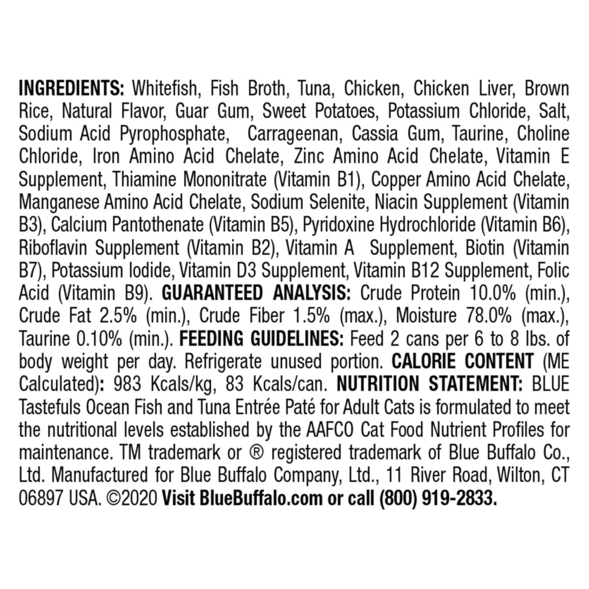 BLUE Tastefuls cat food is so delicious, your cat will keep coming back for more. This silky-smooth paté starts with real whitefish as the first ingredient, plus tuna, wholesome brown rice and sweet potatoes. Made from the finest natural ingredients enhanced with vitamins, minerals and other nutrients, Tastefuls canned food has the great taste cats want with the healthy ingredients you prefer feeding. Let your cat try this mouthwatering wet cat food to see why one taste is all it takes!