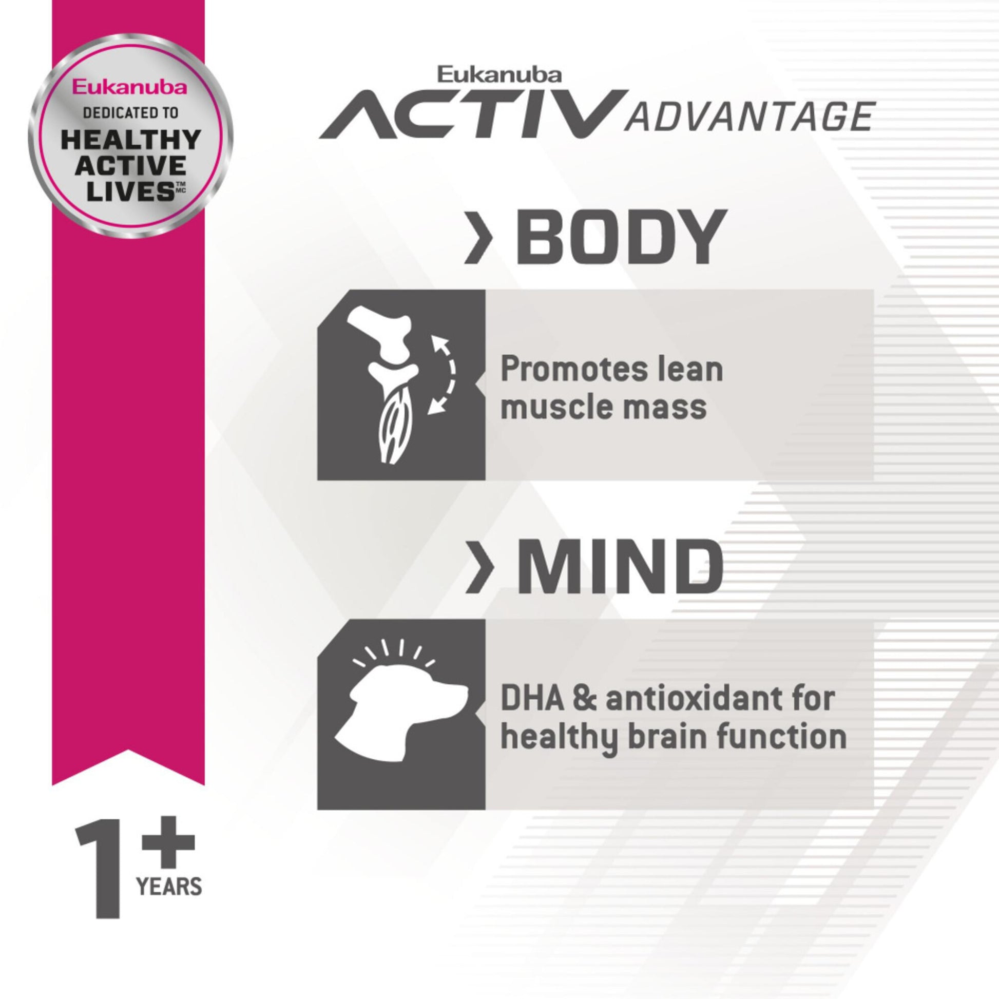 Helps promote a lean, active body with L-carnitine, 39% less fat (vs. Eukanuba Adult Medium Breed dry dog food), and an adapted blend of carbohydrates