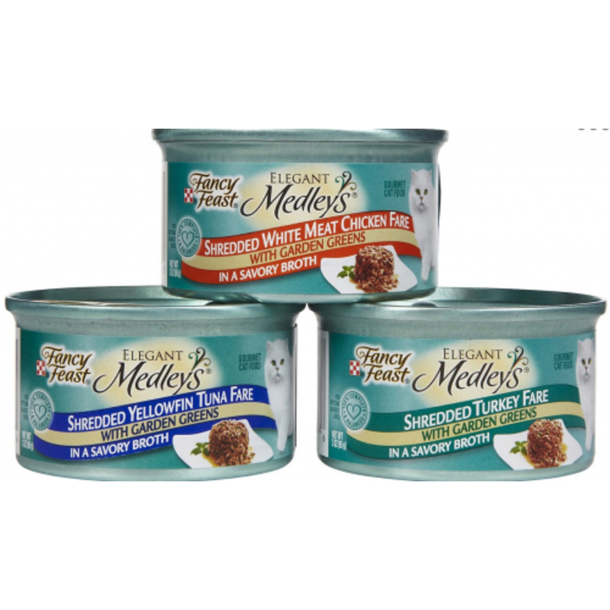 Elegant Medley's are meats and fish combined with savory broth and garden vegetables. All are formulated to meet the nutritional levels established by the AAFCO Cat Food Nutrient Profiles for growth of kittens and maintenance of adult cats. The variety pack includes 4 cans each of three mouthwatering flavors: White Meat Chicken, Yellowfin Tuna and Turkey.