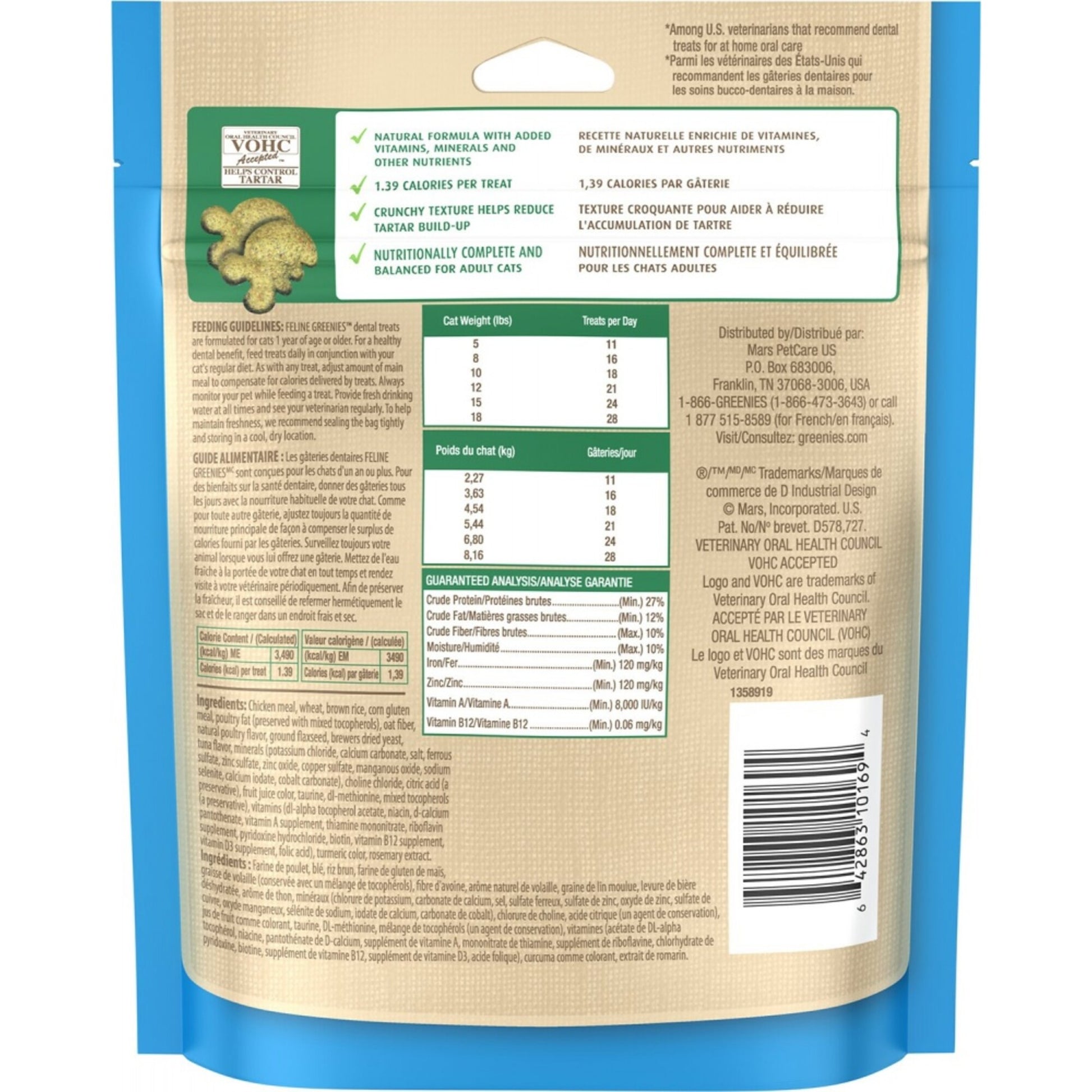 FELINE GREENIES Tempting Tuna Flavor Dental Cat Treats were designed to help keep your cat’s teeth clean and healthy. The crunchy texture of these irresistible cat snacks helps clean teeth, reduce tartar buildup, and freshen cat breath, letting you enjoy cuddle time even more. Made with natural ingredients plus vitamins, minerals, and other nutrients, these tasty treats are also nutritionally complete and balanced for adult cats. Plus, FELINE GREENIES Dental Treats contain less than 2 calories per treat and are the #1 vet-recommended feline dental treat.* Give your cat FELINE GREENIES Dental Treats and you're sure to hear happy purrs of joy. FELINE GREENIES Daily Dental Treats... for healthy and happy dental care. * Among U.S. veterinarians who recommend dental treats for at-home oral care