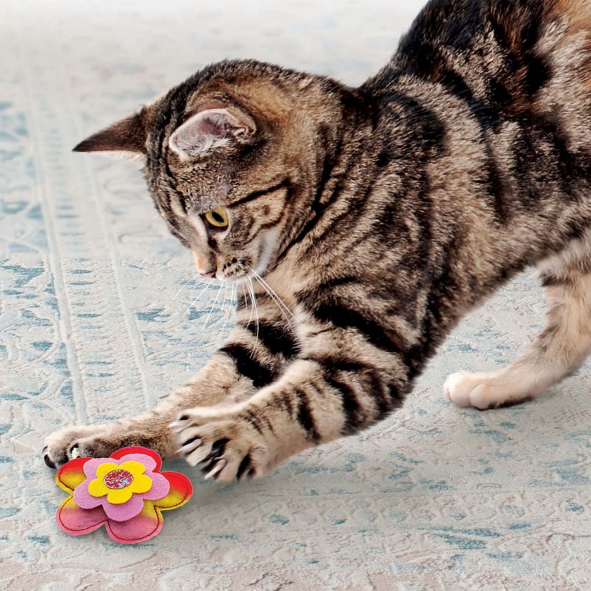 KONG Crackles Bloomz is bursting with crinkle sounds that ignite natural instincts while giving kitty a bouquet of batting fun. The lightweight felt material is ideal for unpredictable games of catch and capture play while the varied shiny colors extend the engagement. KONG North American Premium Catnip helps the fun flourish, adding to the long-lasting indoor play.