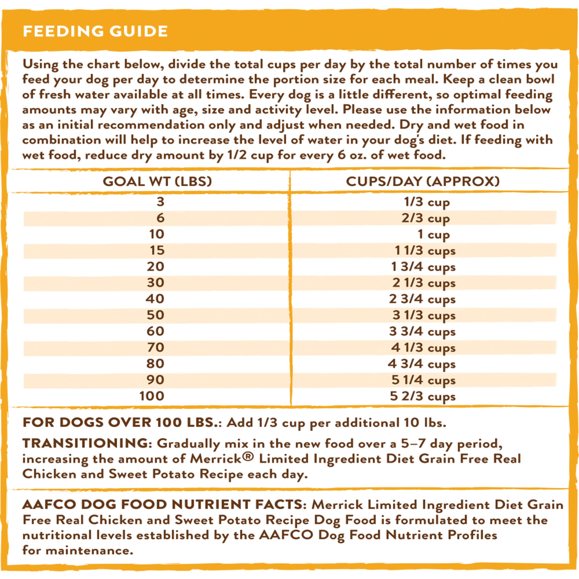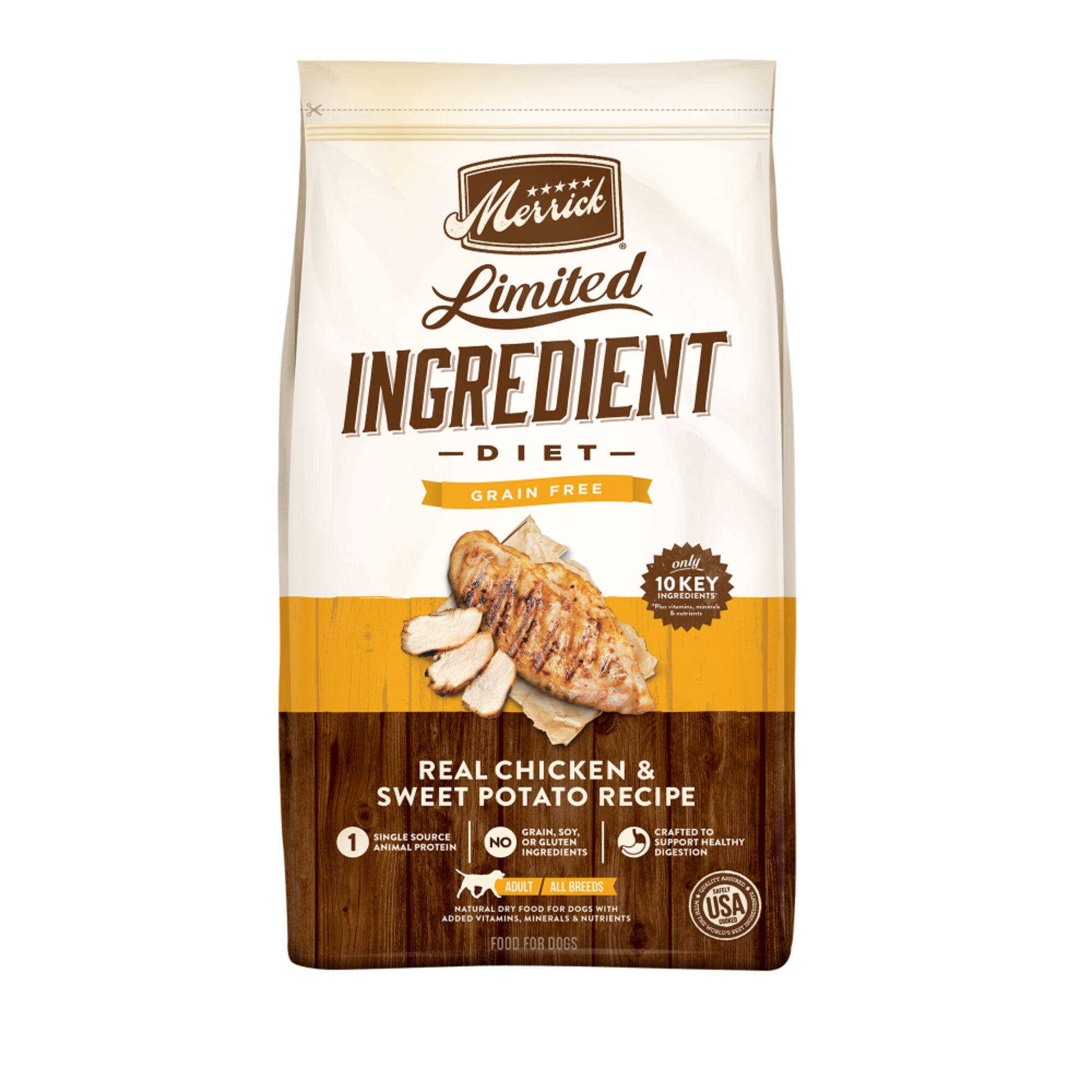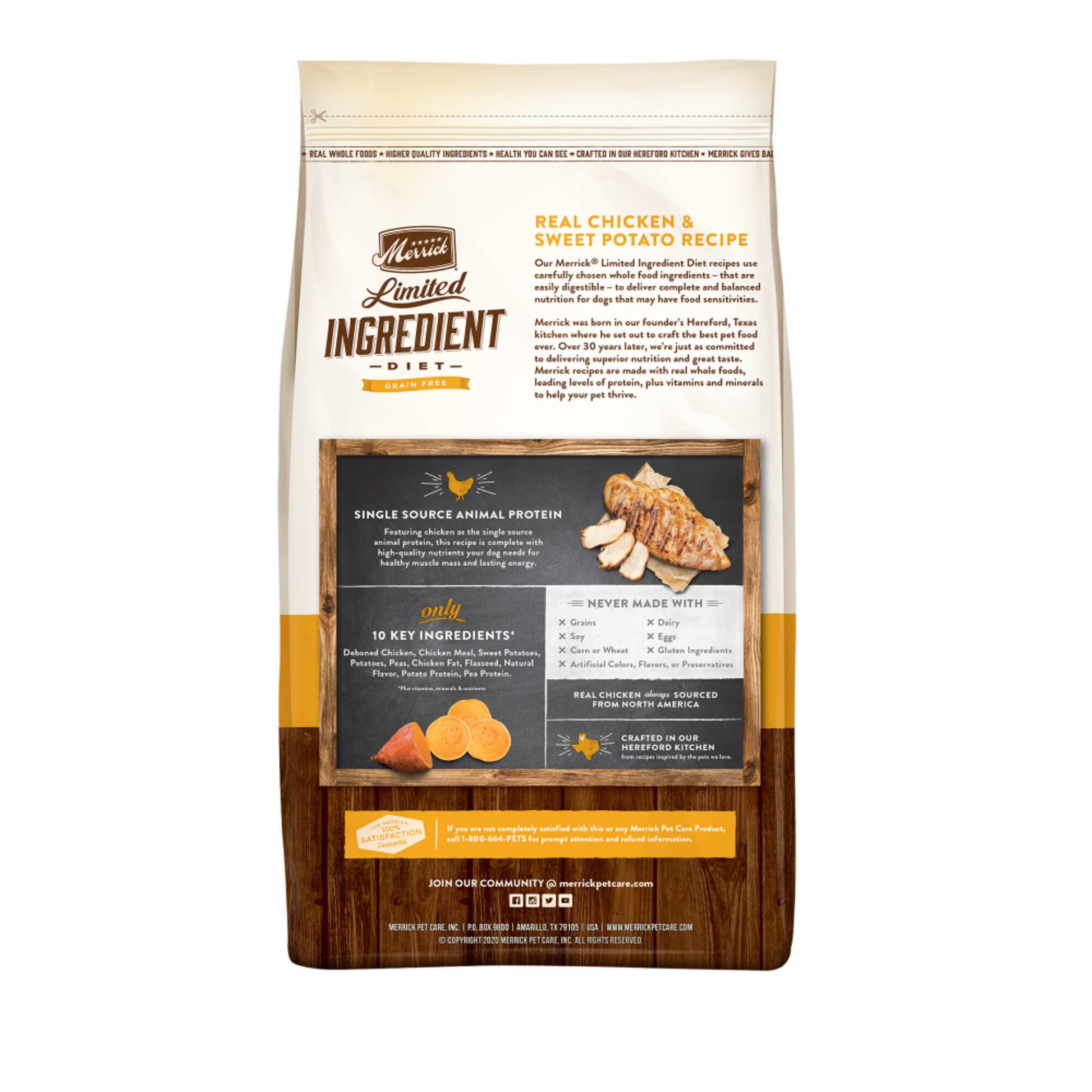 Merrick Limited Ingredient Diet Grain Free Dry Dog Food Real Chicken & Sweet Potato Recipe is specially formulated with just 10 key ingredients for adult dogs with food sensitivities or allergies. Real deboned chicken is always the first ingredient for a single-sourced protein recipe that provides important amino acids, vitamins and minerals for the balanced nutrition dogs need. This gluten free dog food also has no grain or soy ingredients. It is also made without corn, wheat, dairy, eggs or artificial colors, preservatives or flavors. Grain free, this chicken dog food recipe is crafted to support healthy digestion for your dog. Like all Merrick recipes, this limited ingredient dry dog food was crafted in our Hereford, TX kitchen and cooked in the USA.