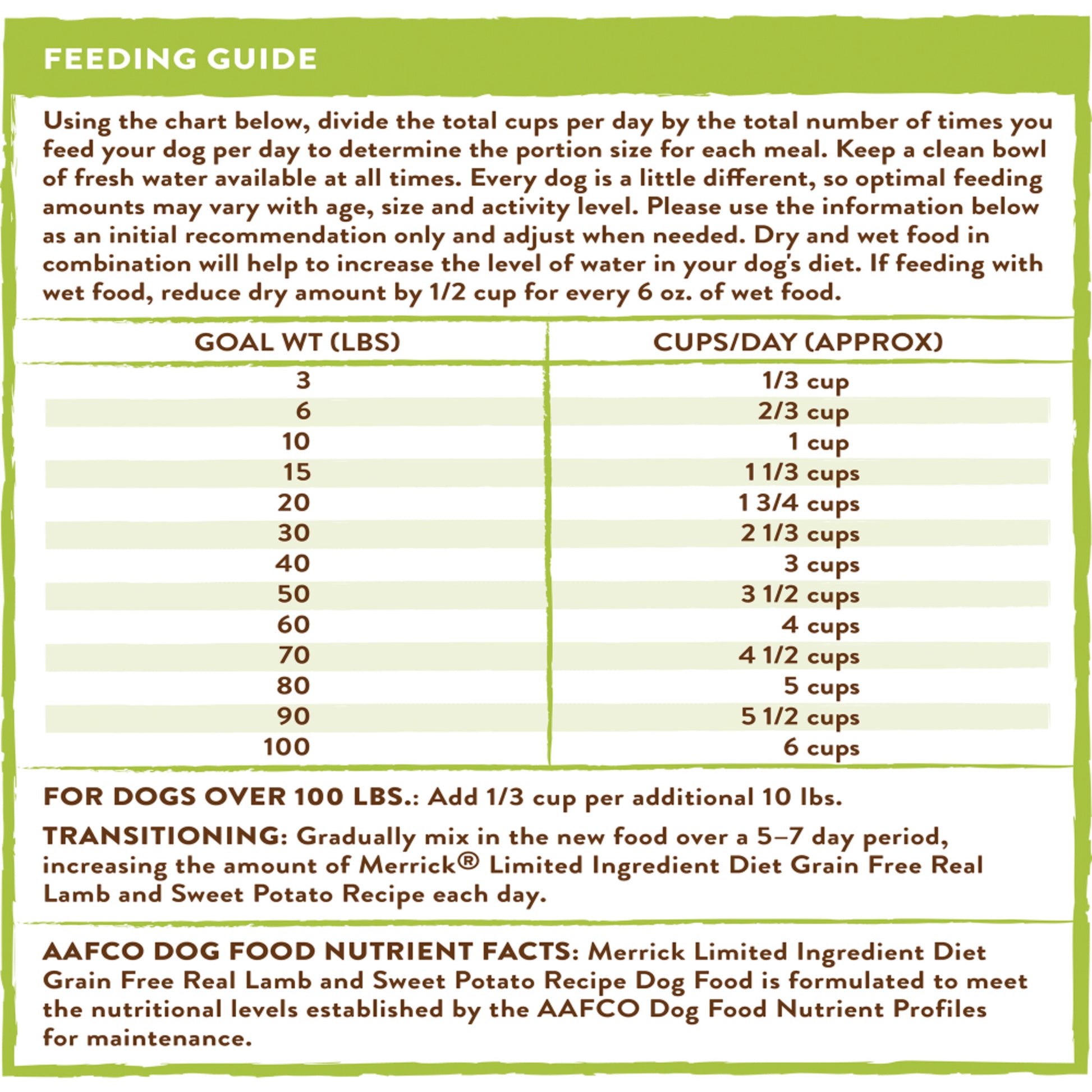 Merrick Limited Ingredient Diet Grain Free Dry Dog Food Real Lamb & Sweet Potato Recipe is specially formulated with just 10 key ingredients for adult dogs with food sensitivities or allergies. Real deboned lamb is always the first ingredient for a single-sourced protein recipe that provides important amino acids, vitamins and minerals for the balanced nutrition dogs need. This gluten free dog food also has no grain or soy ingredients. It is also made without corn, wheat, dairy, eggs or artificial colors, preservatives or flavors. Grain free, this lamb dog food recipe is crafted to support healthy digestion for your dog. Like all Merrick recipes, this limited ingredient dry dog food was crafted in our Hereford, TX kitchen and cooked in the USA.