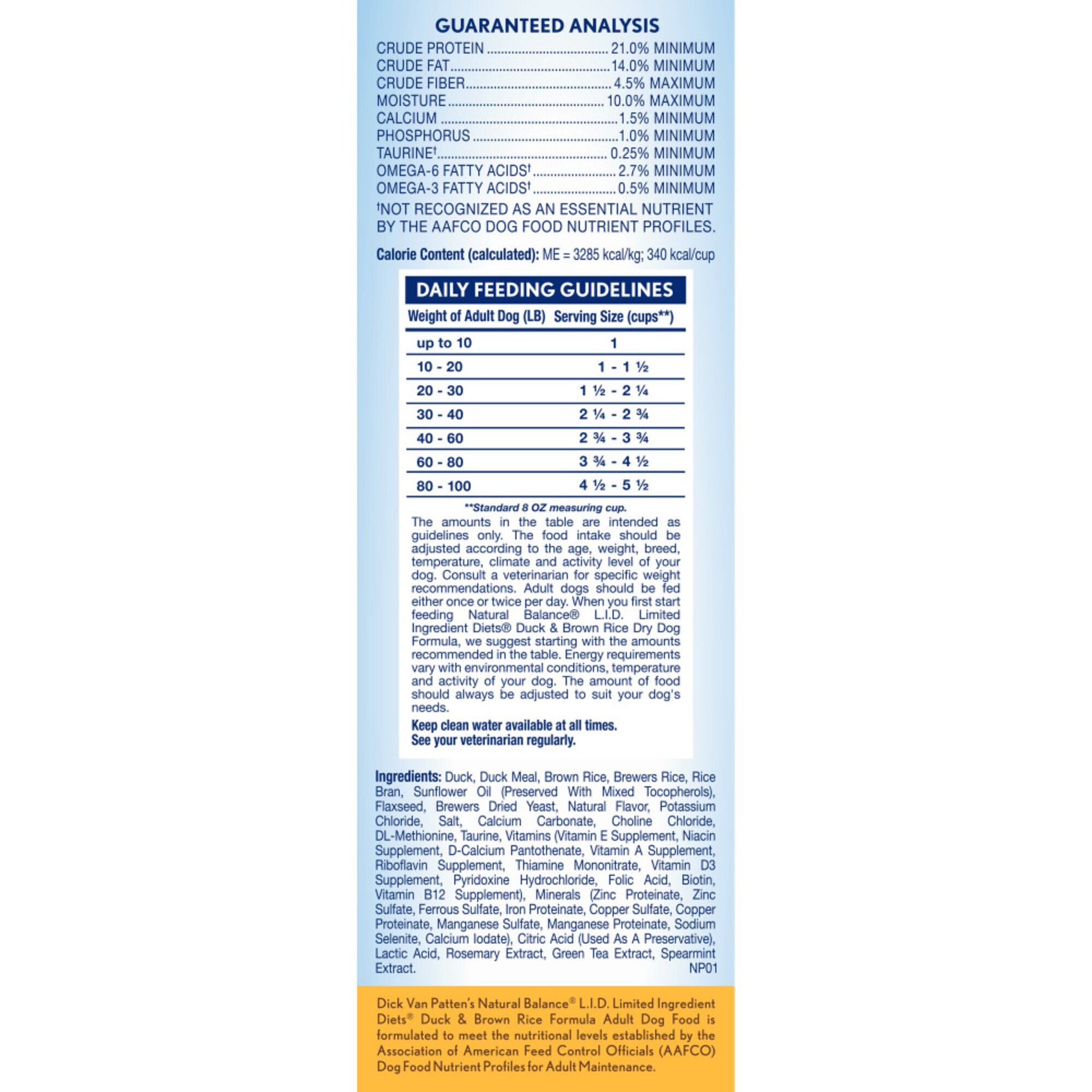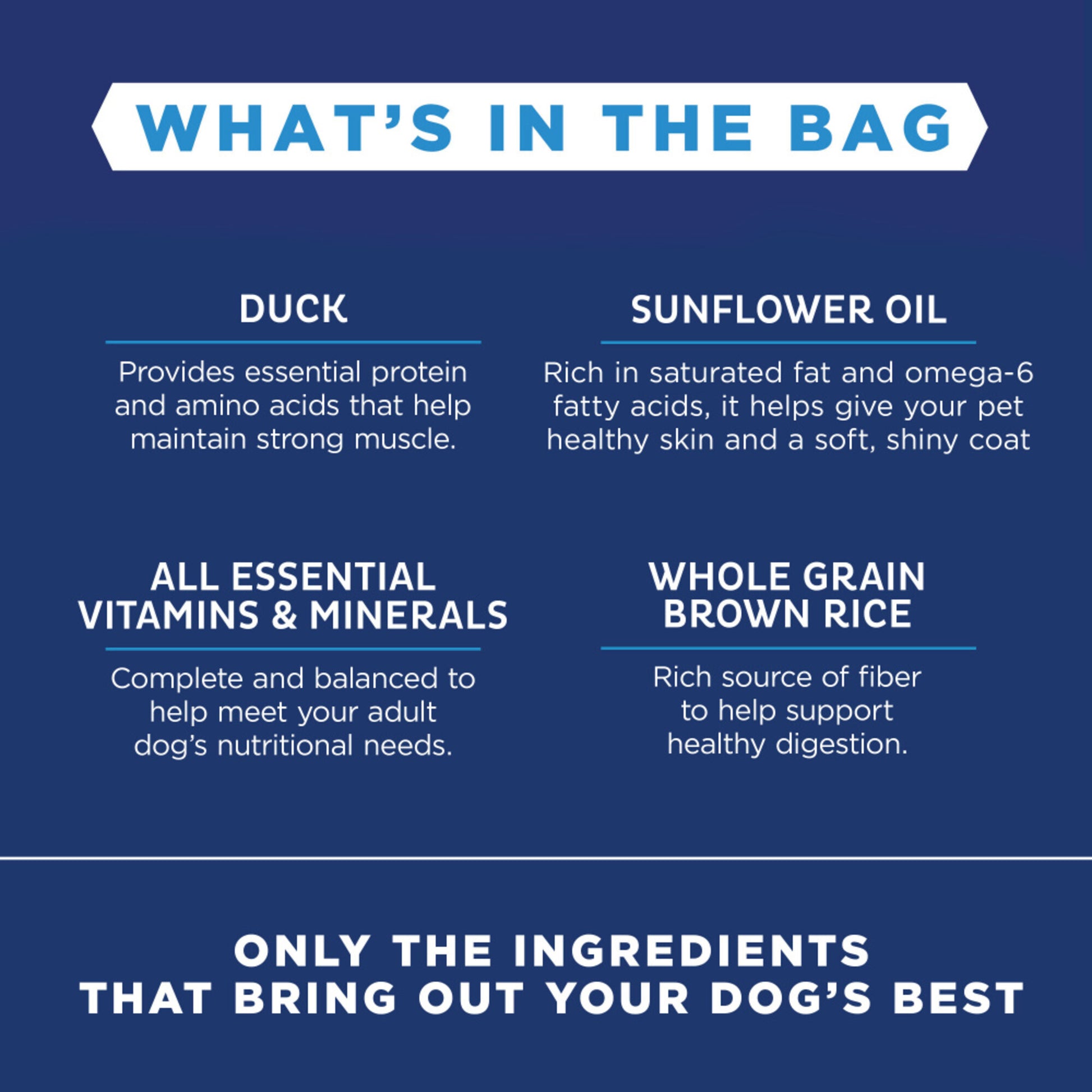 Help bring out your best bud's best with the select, simple, premium ingredients and delicious taste of Natural Balance L.I.D. Limited Ingredient Diets Duck & Brown Rice Formula Dry Dog Food. This grain-inclusive premium dog food is made with no gluten ingredients. The first ingredient is real duck, which provides amino acids — to help build the strong muscles your dog needs to make the most of your adventures together. Meanwhile, whole-grain brown rice contains fiber to help support healthy digestion. And with essential vitamins and minerals, this delicious duck and brown rice formula dog food is complete and balanced for adult dogs of all sizes. To top it all off, like all Natural Balance products, it's backed by our Buy With Confidence promise, so you can rest assured that it's healthy, tasty and safe.