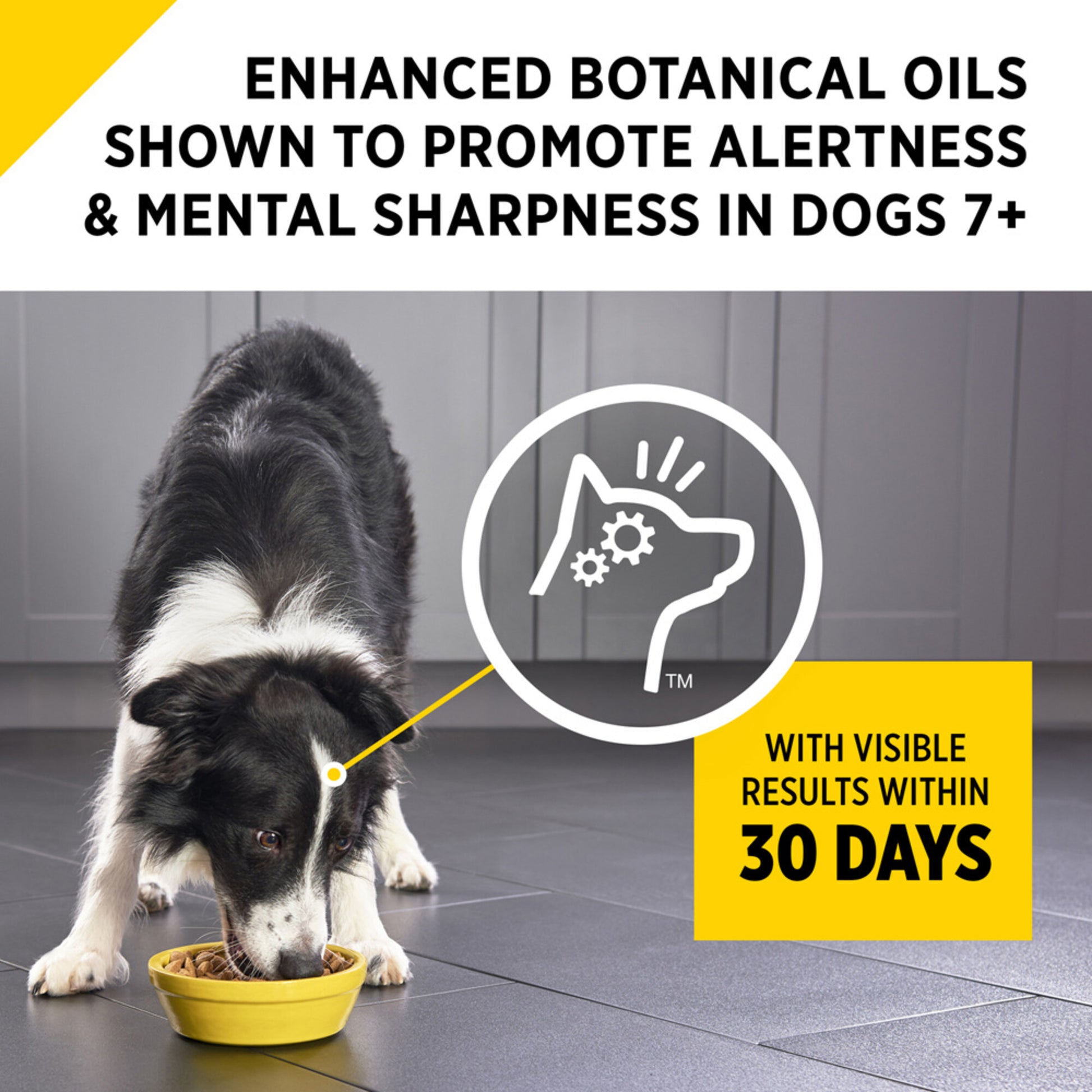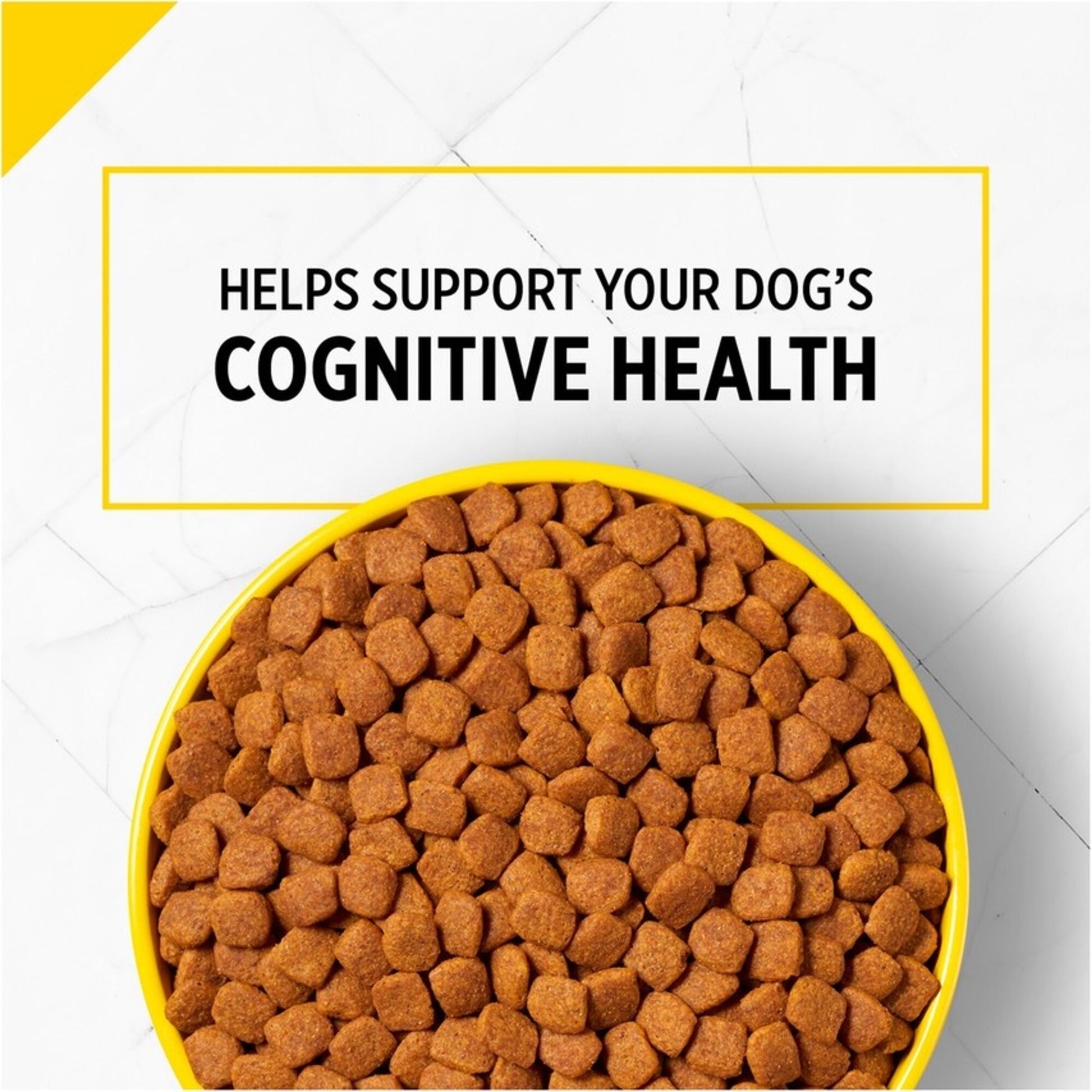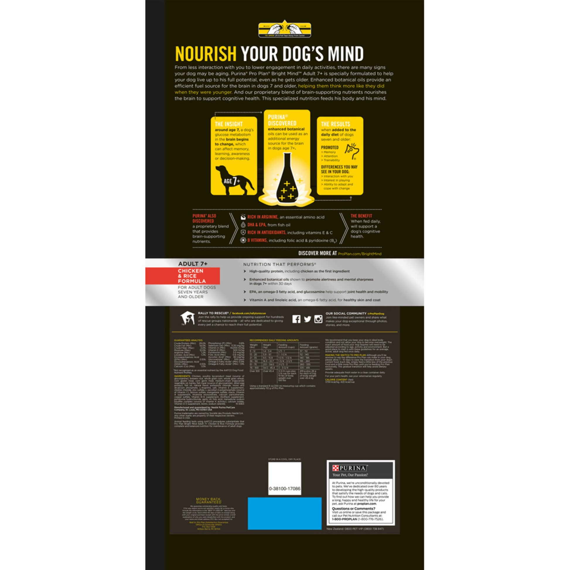 Nourish your dog's mind and help him think more like he did when he was younger with Purina Pro Plan BRIGHT MIND Adult 7+ Chicken & Rice Formula dry dog food. Around age 7, a dog's brain begins to change how it metabolizes glucose, which can affect learning or awareness. Our proprietary research shows that enhanced botanical oils provide an efficient fuel source for the brain, in dogs age 7 and older, and these oils nourish your dog's brain, helping him think more like he did when he was younger. Alertness and mental sharpness are promoted in dogs over the age of 7 who eat this food daily. This dry dog food has chicken as the number one ingredient, which provides your dog with a high-quality source of protein. Glucosamine and EPA, an omega-3 fatty acid, support your dog's joint health and mobility, while vitamin A and linoleic acid promote healthy skin and a beautiful coat. You can feel good about feeding him a formula designed to deliver top-tier, highly specialized nutrition.
