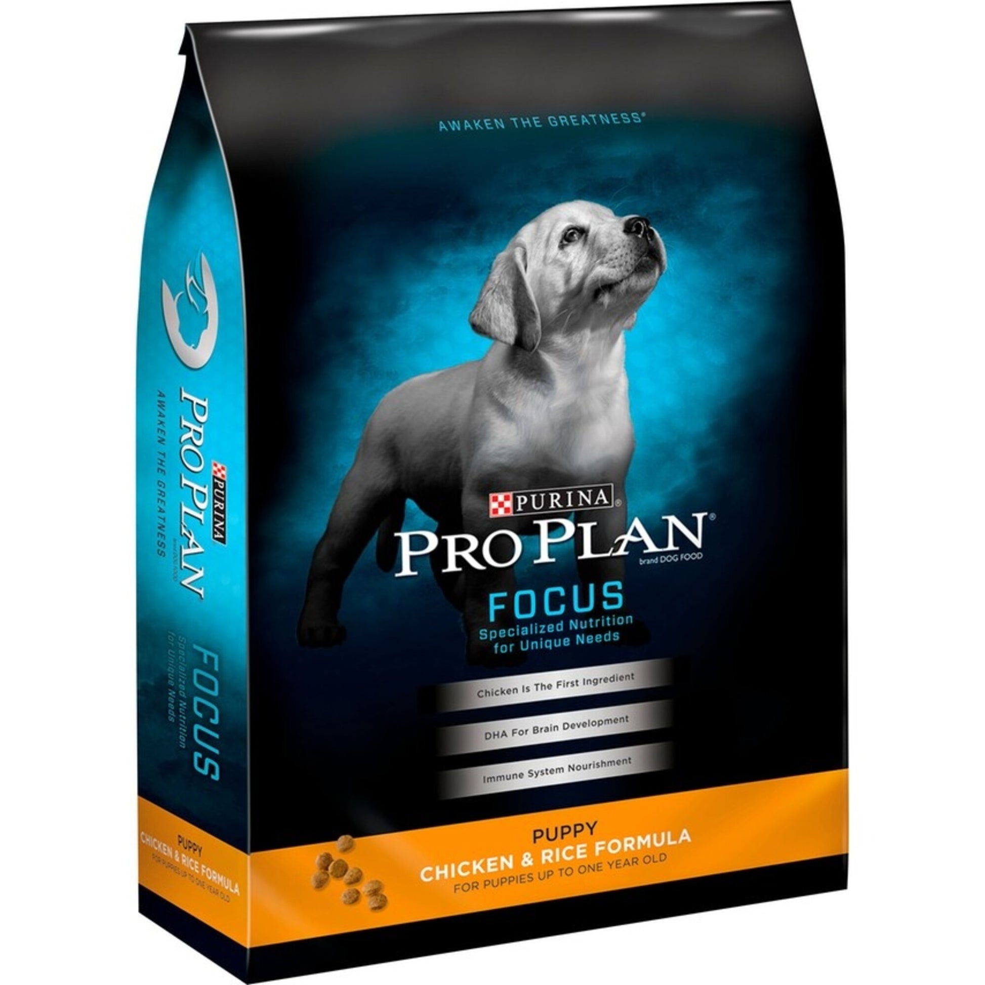 Care for your puppy's nutritional needs with Purina Pro Plan FOCUS Chicken & Rice Formula puppy dry dog food. High-quality protein sources, including chicken as the #1 ingredient, help your puppy develop healthy muscles so that he can maintain his playful lifestyle. DHA from omega-rich fish oil in this puppy formula helps to nourish his brain and vision development, and calcium, phosphorus, and other minerals help to build strong teeth and bones. This super-premium dog food will keep your puppy happy at mealtime, and you can have confidence he is getting the 100% complete and balanced nutrition his body needs at this early stage of development. Offer up this Purina Pro Plan FOCUS puppy food recipe to show your puppy you care about his overall health and well-being while giving him a food designed to meet the unique nutritional needs of your growing puppy.