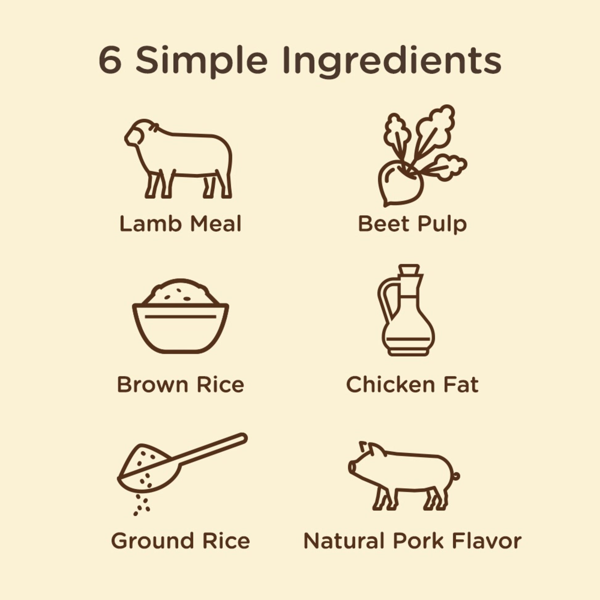 Rachael Ray Nutrish Just 6 is made with just six simple, natural ingredients with added vitamins & minerals. Lamb meal is the #1 ingredient, followed by five other wholesome ingredients. Of course, Just 6 doesn't contain any corn, wheat, soy or gluten ingredients. And there's never any poultry by-product meal, artificial flavors, colors or artificial preservatives. Nothing but good, wholesome food here!