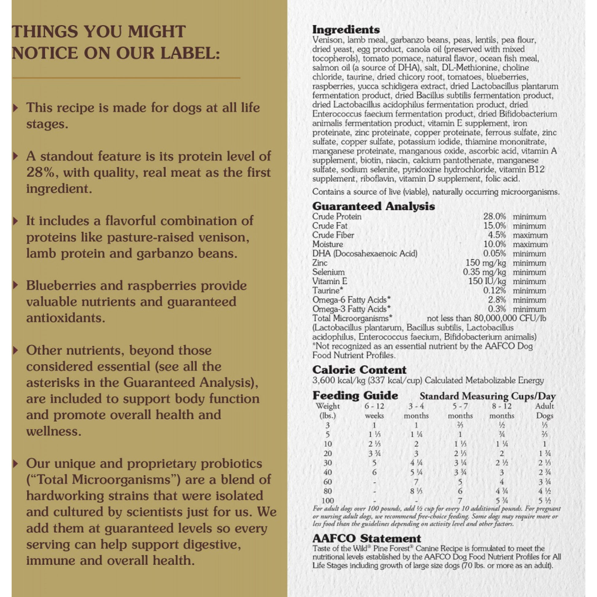 Taste of the Wild Pine Forest is a high quality, grain-free venison and lamb based recipe that is sure to please your canine carnivore. An excellent alternative to chicken based recipes, with zero grains, and supplemented with pre and probiotics for efficient digestion, this recipe is complete with nutritious carbs like sweet potatoes, peas, carrots, and blueberries for healthy energy and vitamins and minerals. With lamb as the first ingredient, this diet is designed to mimic an ancestral diet free of grains, yet packed with real meat as nature intended. Your dog will find all the nutrition their bodies need in Taste of the Wild Pine Forest, all while staying away from the nasty excesses like corn, soy or meat by-products.
