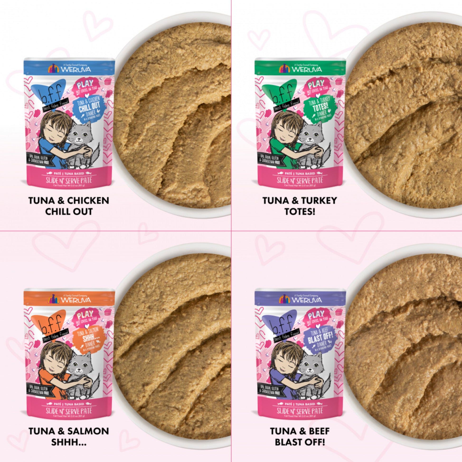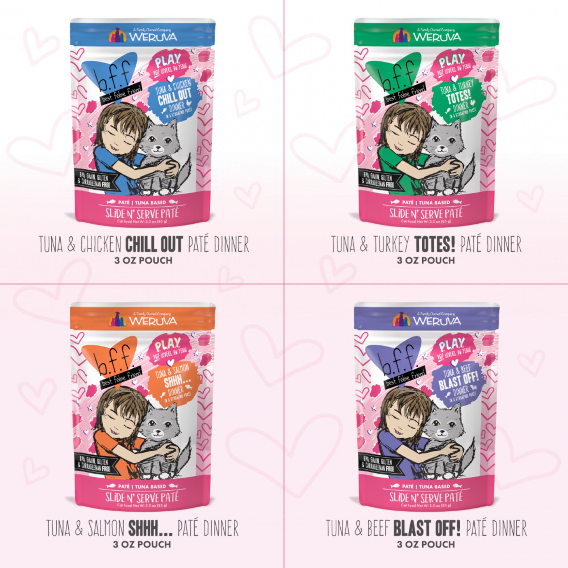 With so many delicious patés to choose from, your favorite feline will be ready to party all night long! The Paté Partay! Pouch Variety Pack includes 3 each of your kitty’s favorite B.F.F. PLAY! pouches: Tuna & Chicken Chill Out, Tuna & Salmon Shhh..., Tuna & Beef Blast Off!, Tuna & Turkey Totes!